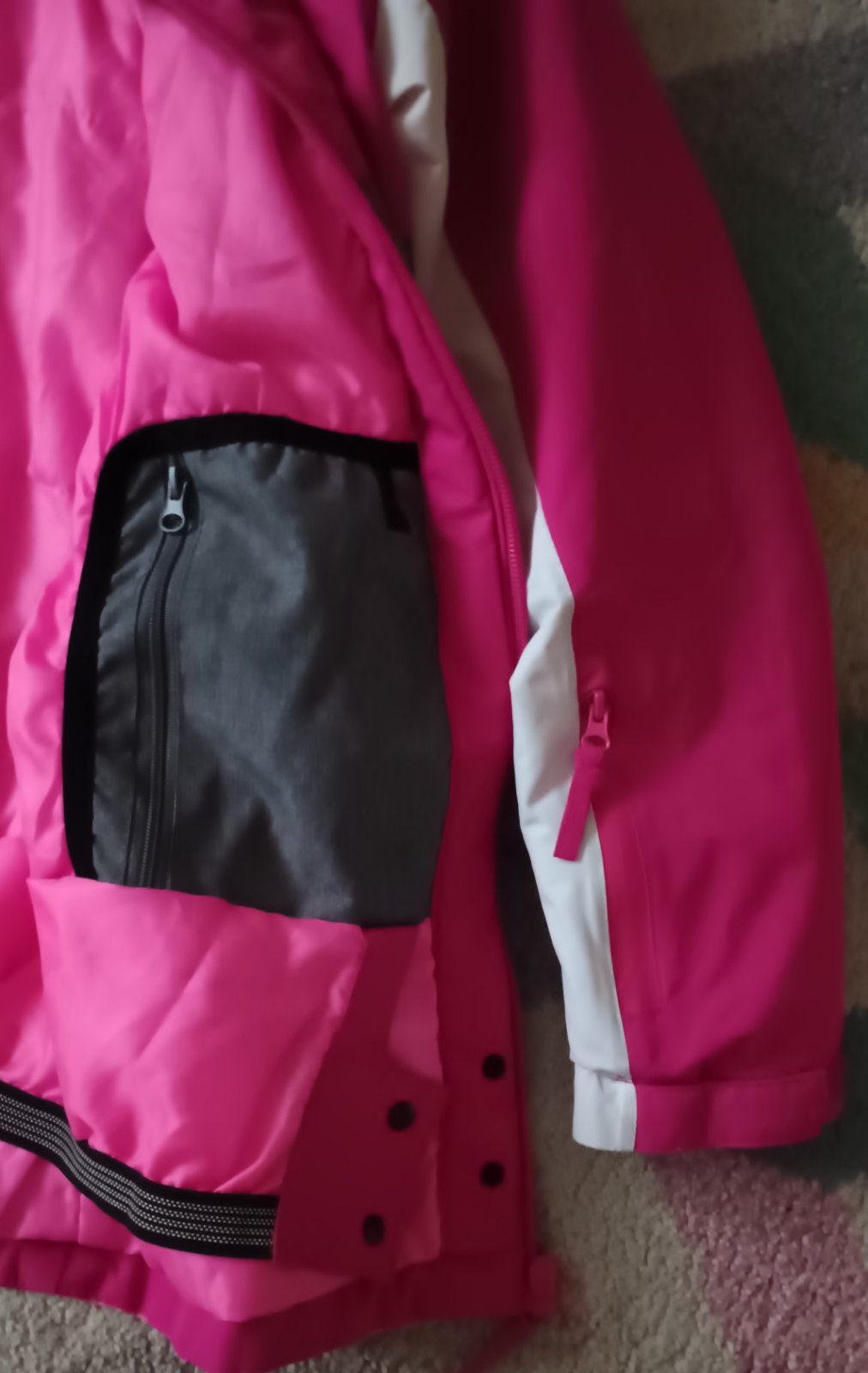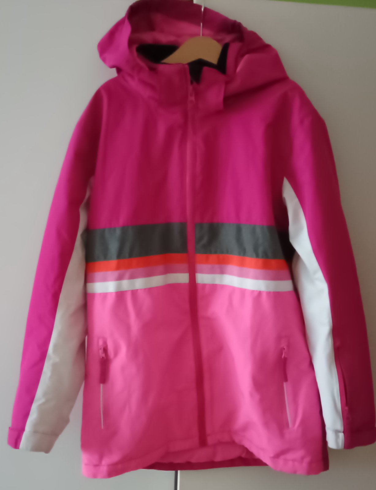 Krásná lyžařská bunda,má několik kapsiček zvenku i uvnitř bundy,sněžný pás,kapuce lze odepínat,kapsička i na rukávu ,velikost 146/152,zdarma k ní přidám tričko