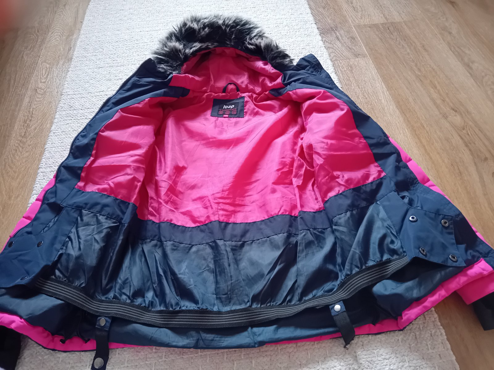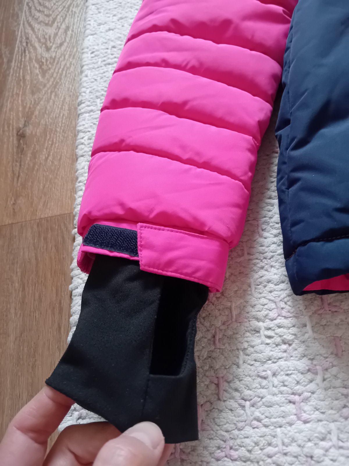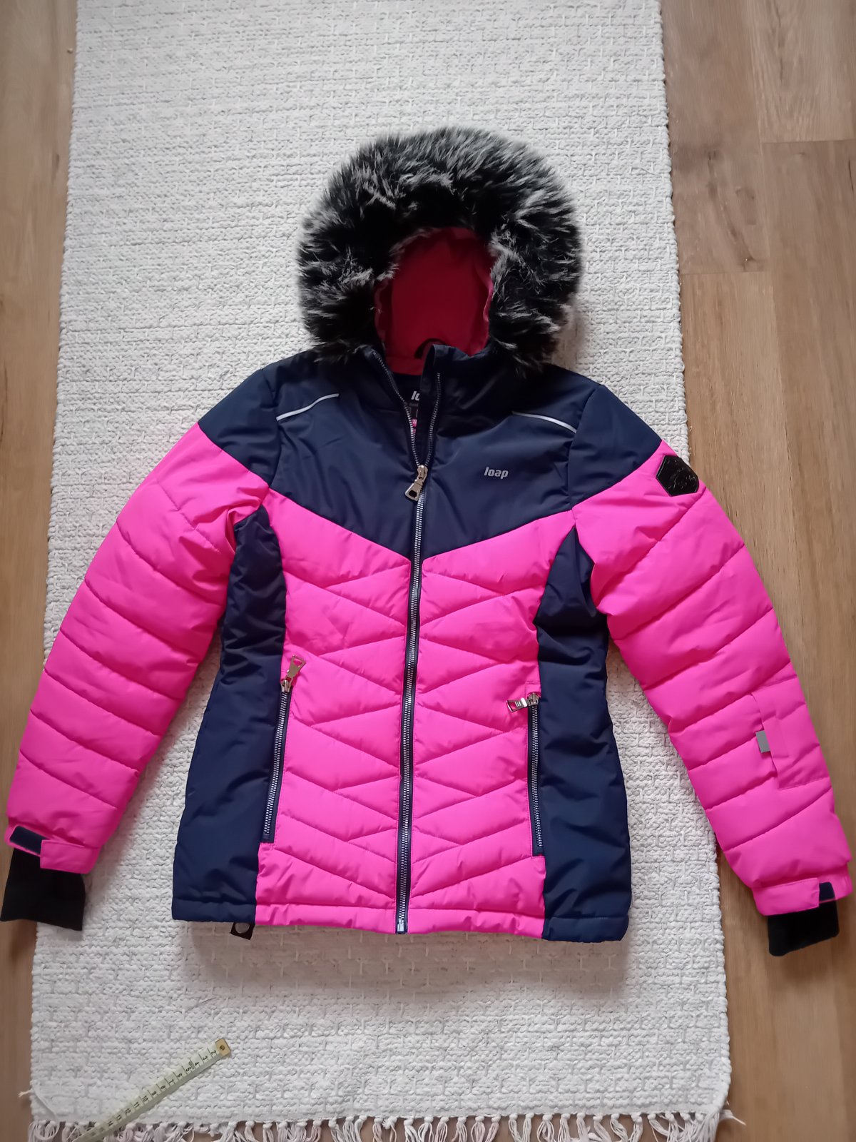 Krásná zachovalá zimní bunda (růžovo-modrá, barvy pořád krásně syté), lze použít i na lyže, má vnitřní zapínací bederní pásek; kapuce lemovaná kožíškem, v rukávech všitá ochrana dlaní - viz. poslední foto. Velmi slušivý kousek.