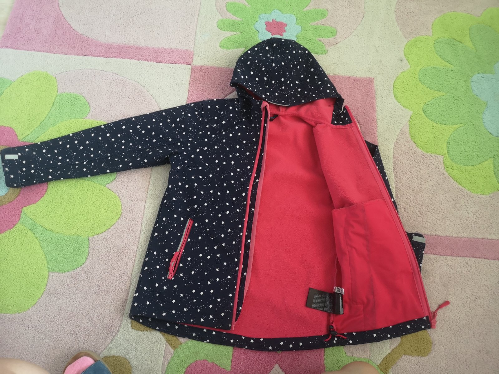 Nádherná barevná kombinace, z 100% polyesteru, uvnitř lehká síťovaná podšívka, dole uvnitř karabinky na stažení, vepředu kapsy na zip, rukáv do gumy a sucháče, dl. 58 cm, š. 2x43, rukáv od ramene ...