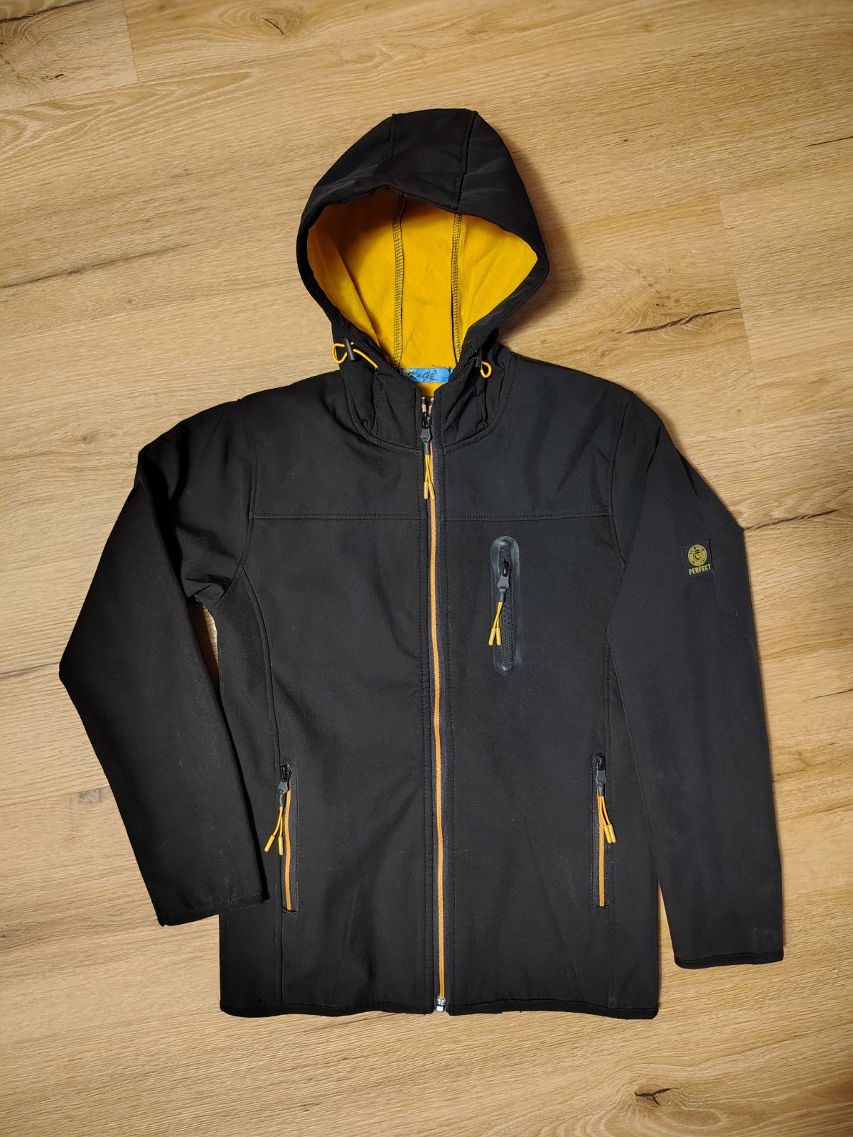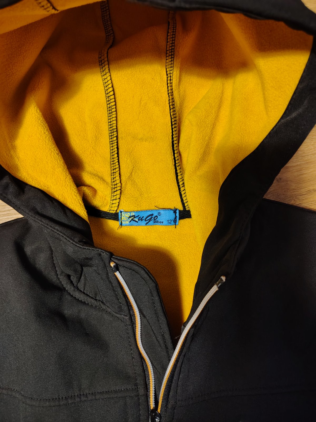 Dětská černá softshellová bunda Kugo 12 let, je z vnitřní strany zateplená z micro fleecu barvy hořčičně žluté, včetně zipů a detailů. Hlavní zip je podložen légou, má dvě přední kapsy na zip, rukávy, dolní kraj bundy jsou všité do ploché gumičky a kapuce je na zatahovací gumičku žluté barvy.