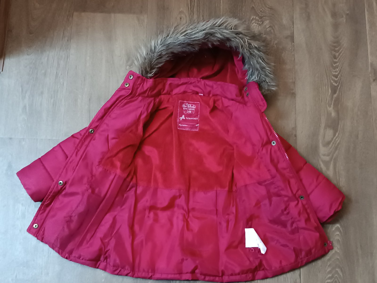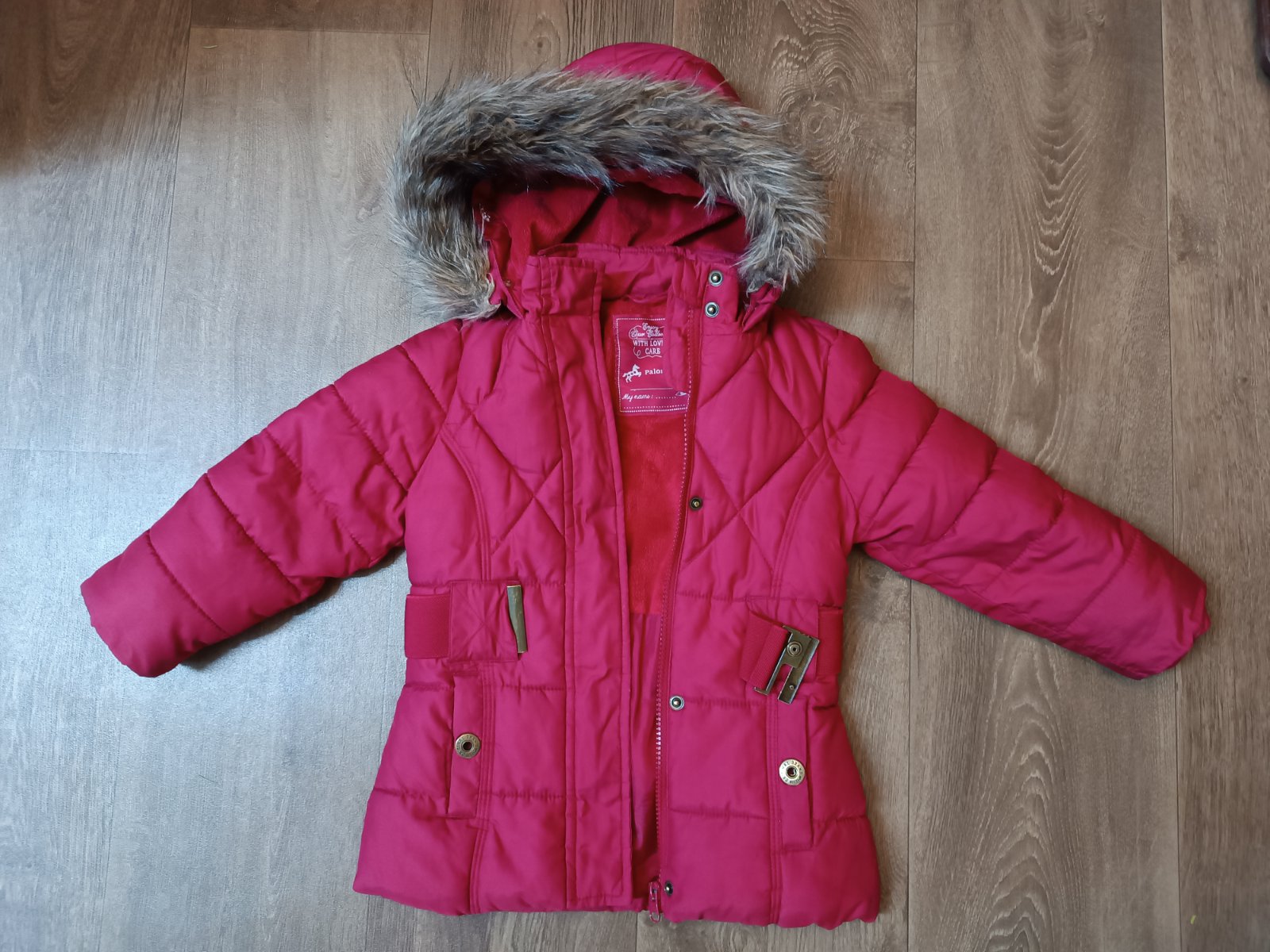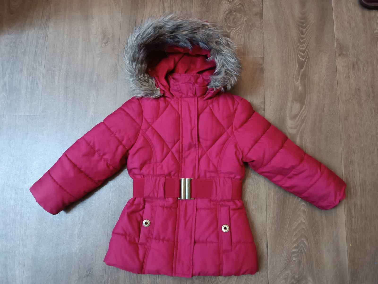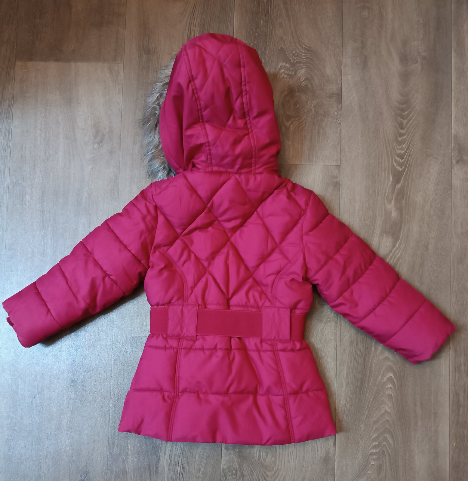 Nabízím dívčí červený kabát/delší bundu, zn.Palomino, (C&A), vel. 98. Nošený, hezký stav,v pase přezka, s kapucí. Kožešina na kapuci lze odepnout, zapínání na zip+ochrana bradičky, v přední části 2 funkční kapsy. Velikost odpovídá, vydrží i déle.