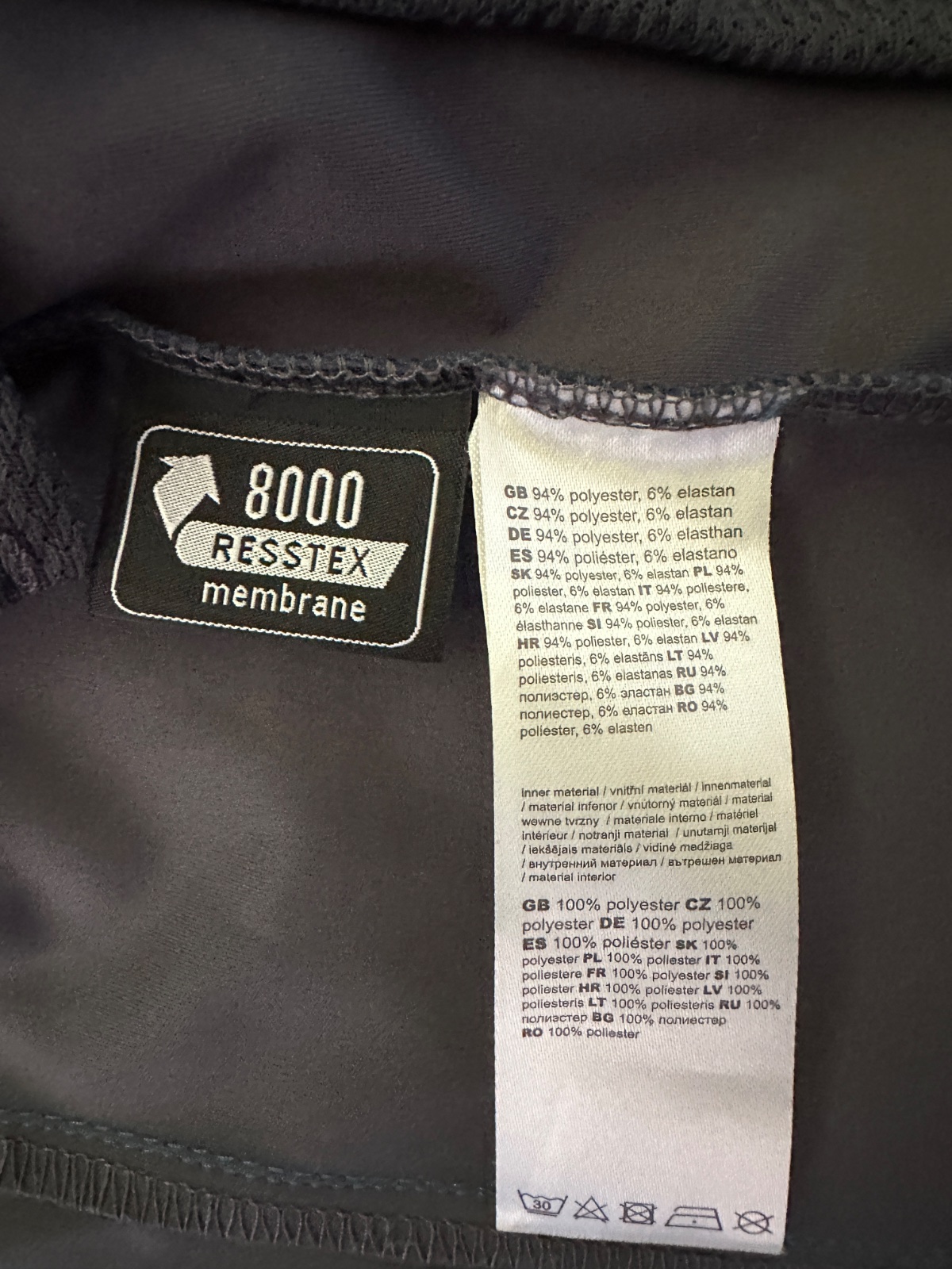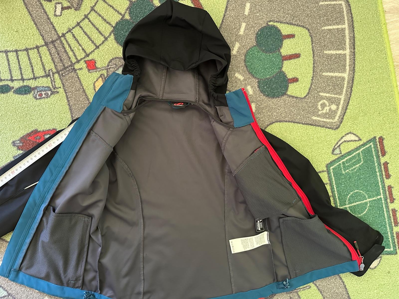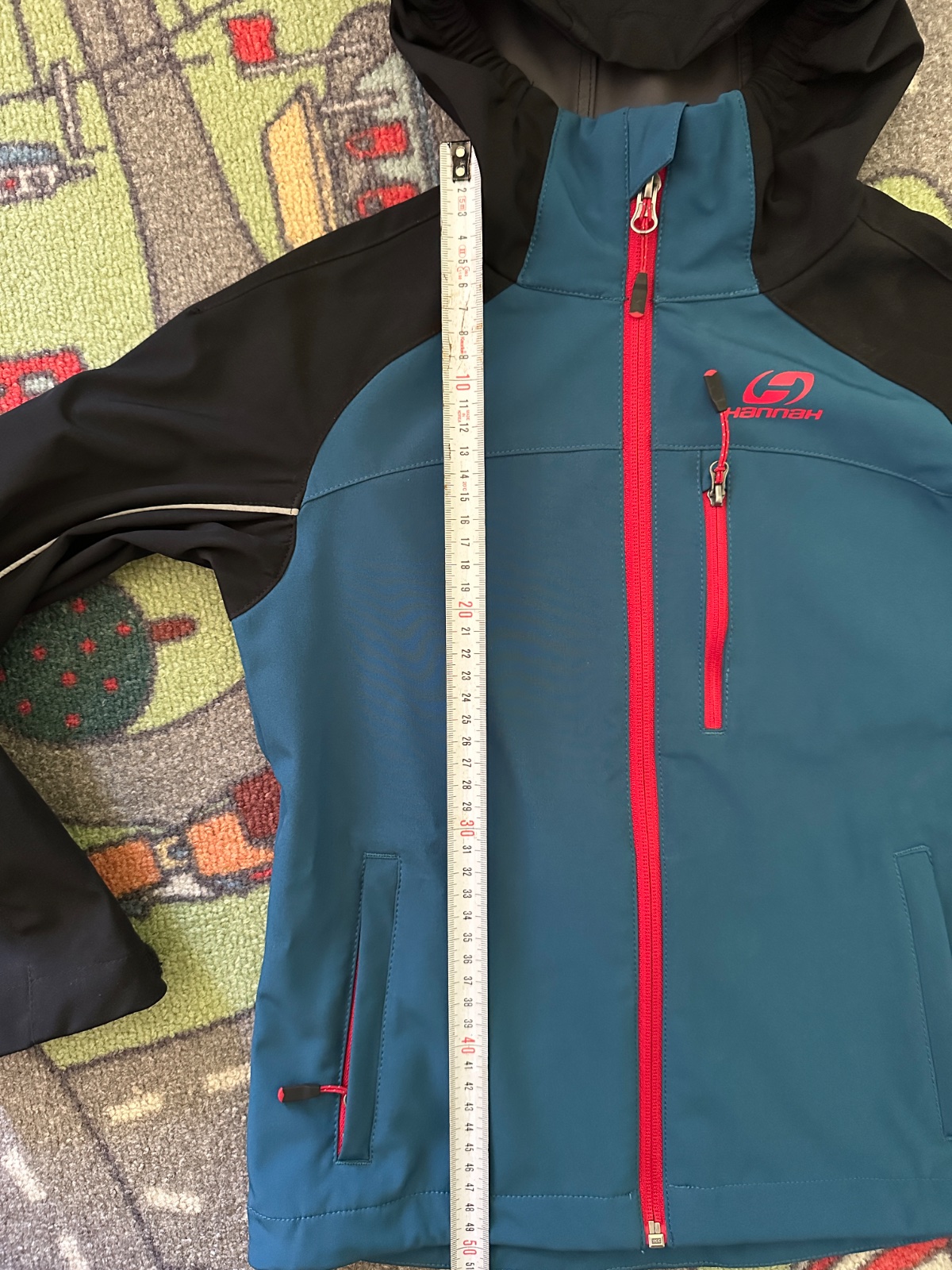 Nezateplena softdhellova bunda Hannah vel 128, restech 8000, kapuce není odepínací, staženi dolního lemu a rukávu. Kapsy na zip.