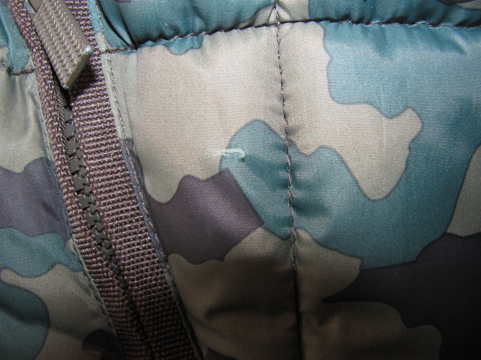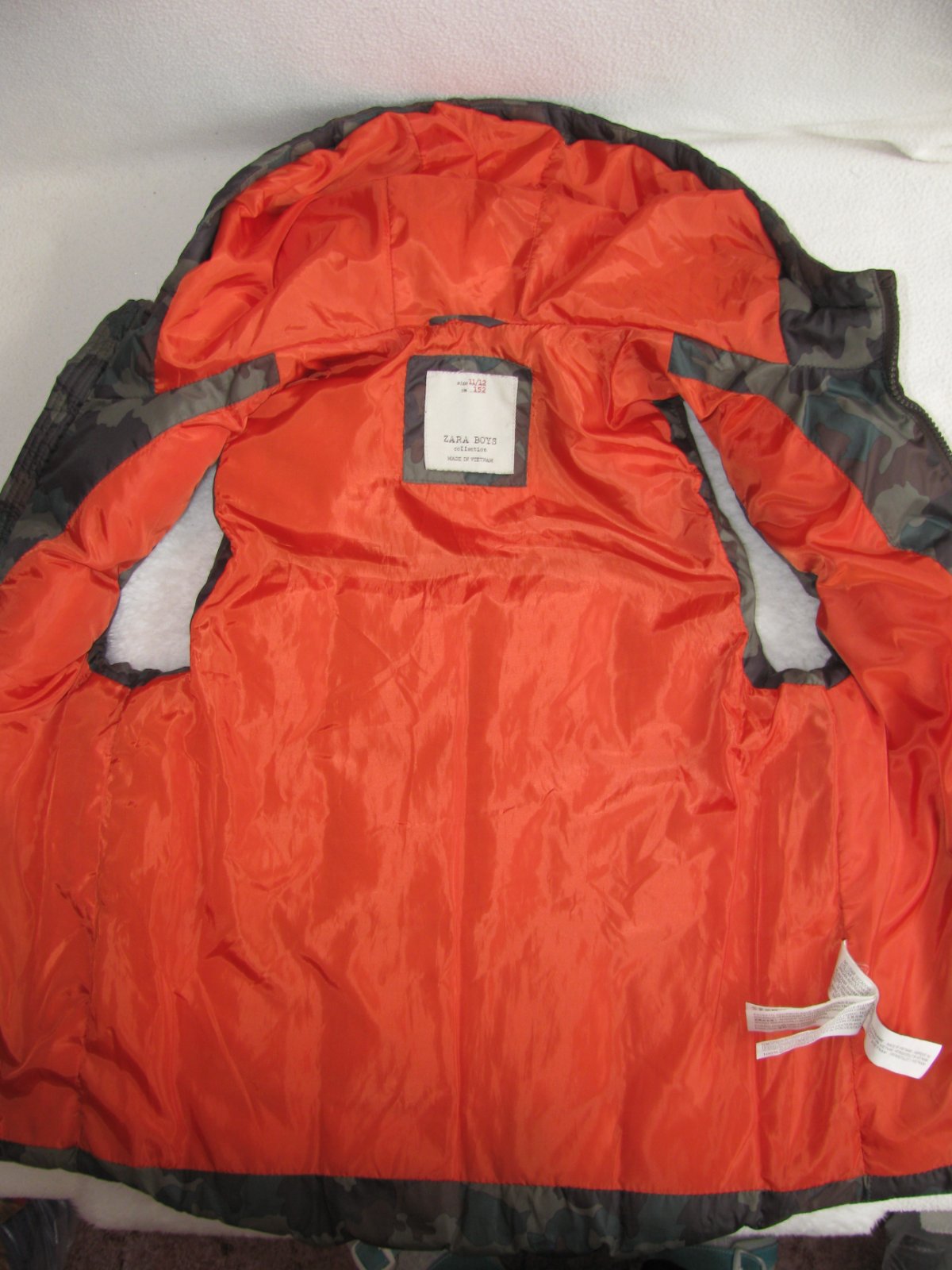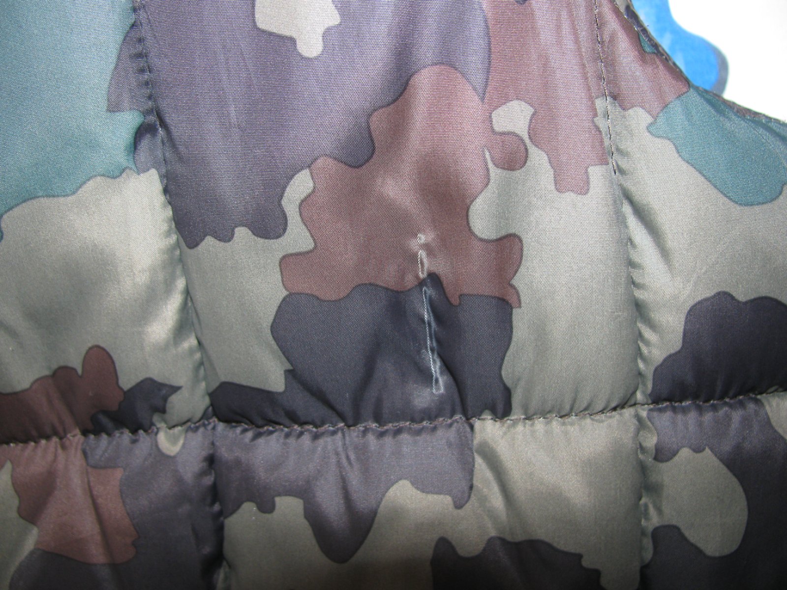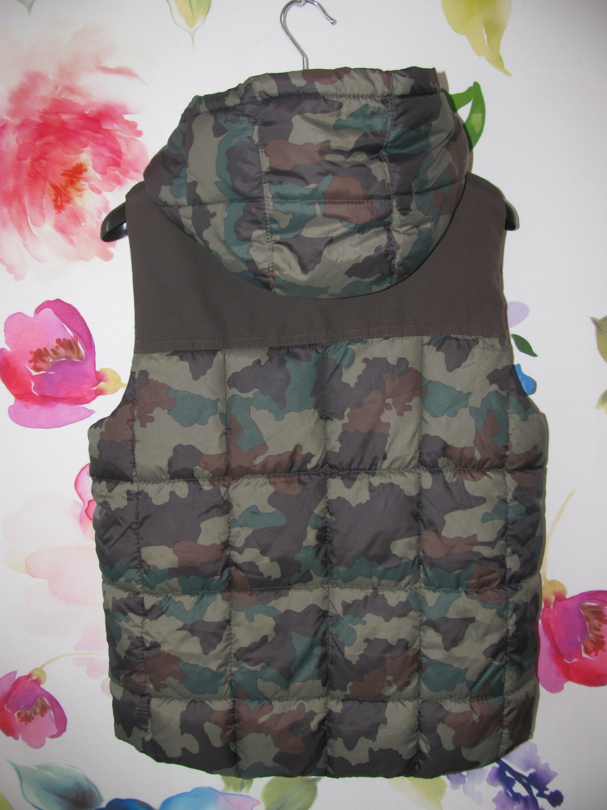 Perfektní maskáčová, prošívaná vesta s kapucí, záda prodloužená, boční kapsy na zip, zap. na zip, náševka s logem, 100% polyester. Malý kaz ve tkanině, 2mm dírka vedle kapsy-viz fota, jsou to nepatrné vady, přesto raději upozorňuji pro pořádek. Jinak perfektní stav bez dalších vad.