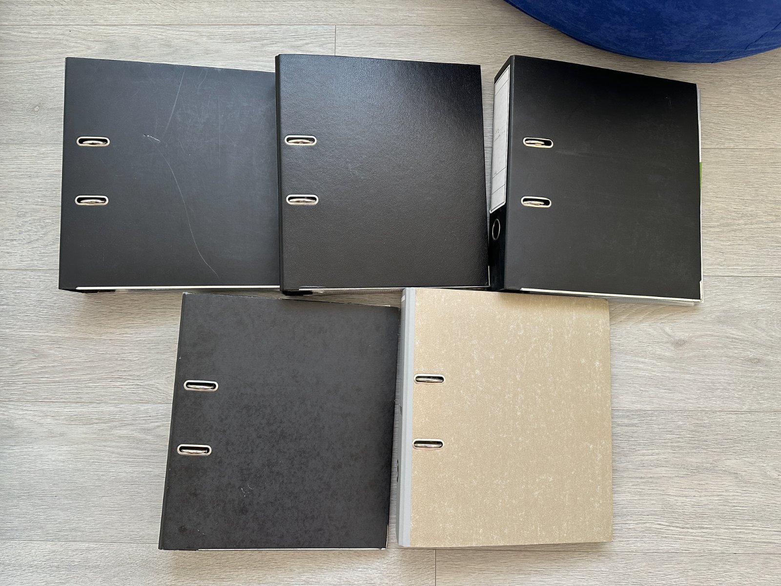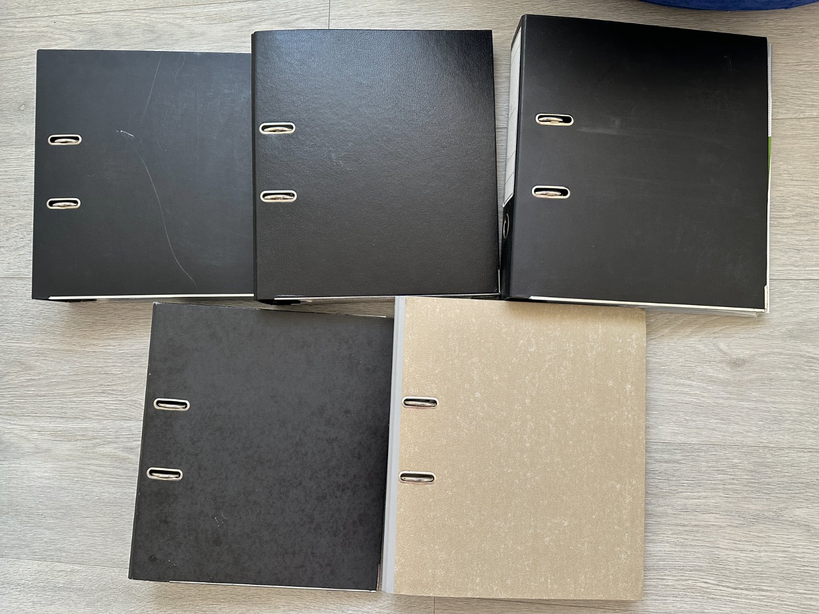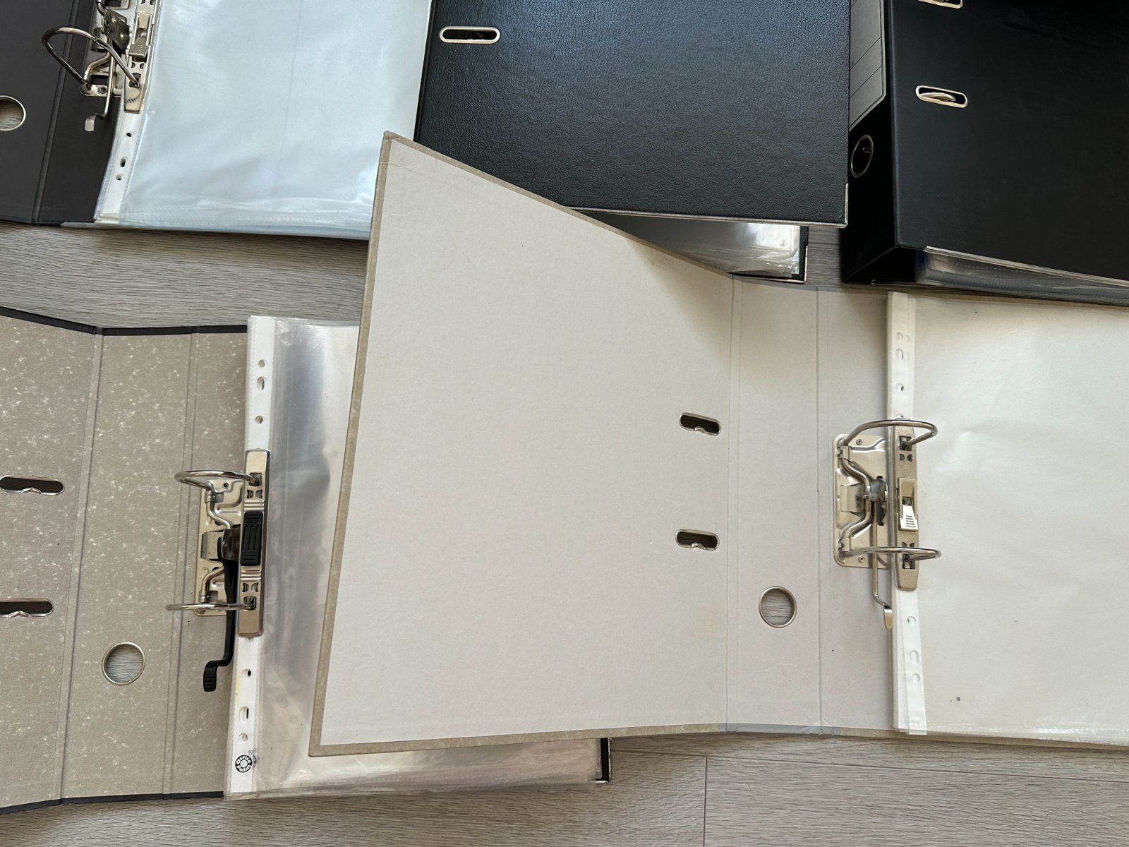 Šanon na dokumenty / pákový pořadač, 5 ks vč. euroobalů - 4x černý šanon - 1x šedý šanon - uvnitř každého šanonu několik euroobalů - cena je za všech 5 kusů šanonů s euroobaly