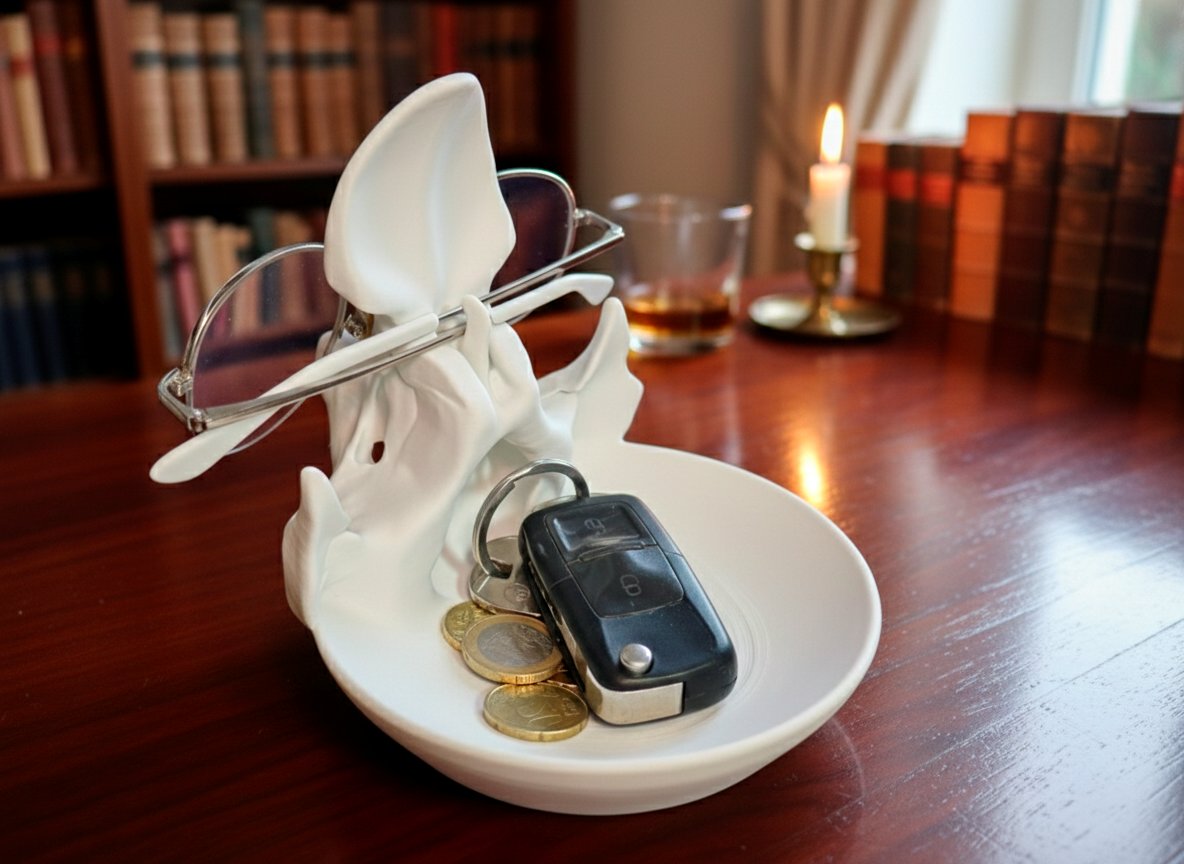 Stylový stojánek na brýle a klíče ve tvaru lebky. Skvělá dekorace i praktický doplněk na stůl, komodu nebo do chodby. Ideální jako dárek pro milovníky originálních dekorací.