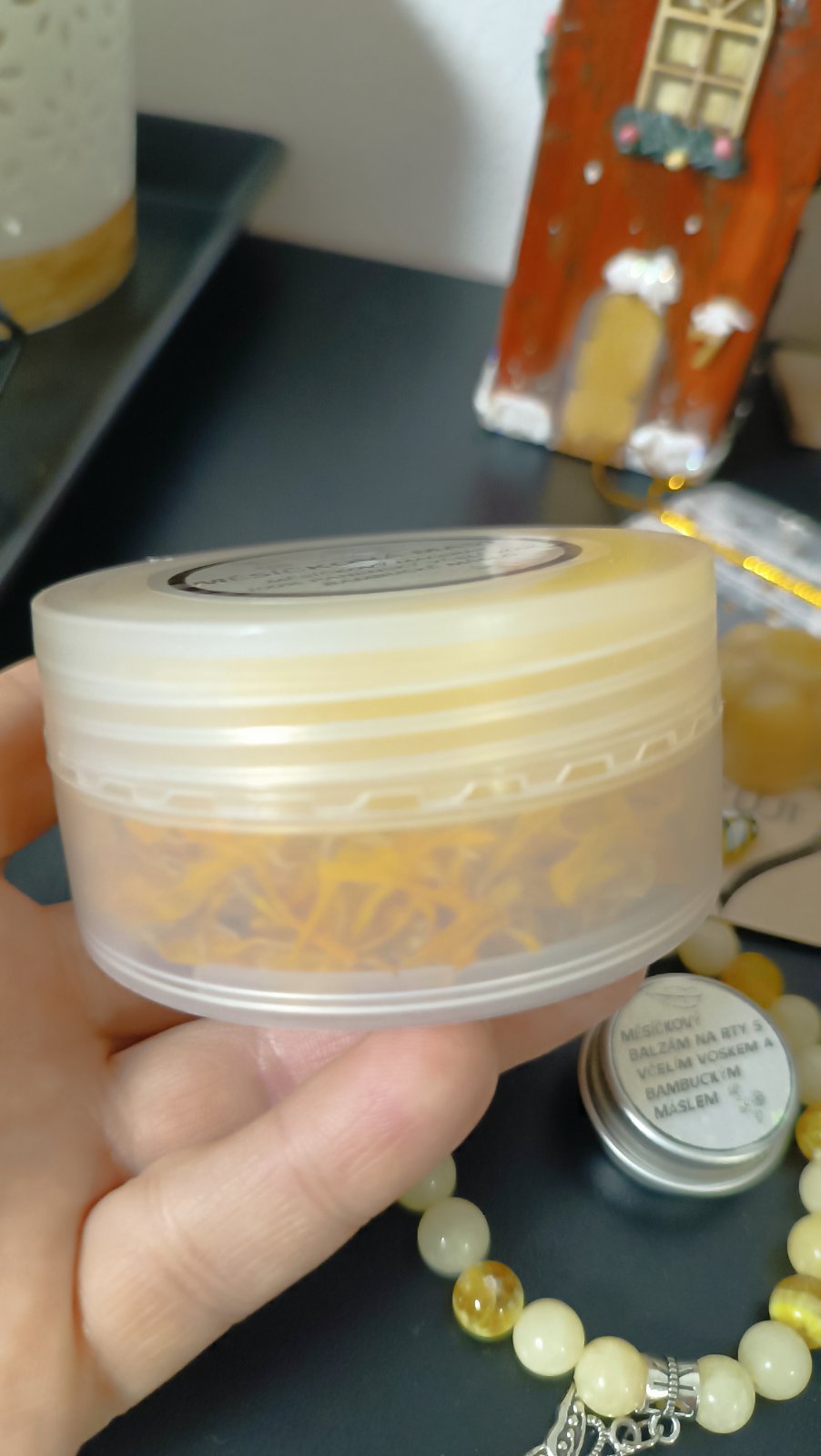 Mast i balzámek jsem odlévala v půlce ledna 2026 - složení - za studena macerovaný měsíček lékařský z naší zahrádky v rostlinném oleji (několik týdnů), panenský a včelí domácí vosk + bambucké máslo... Krom jiných léčebných vlastností je pro nás nepostradatelným pomocníkem v tomto počasí...
