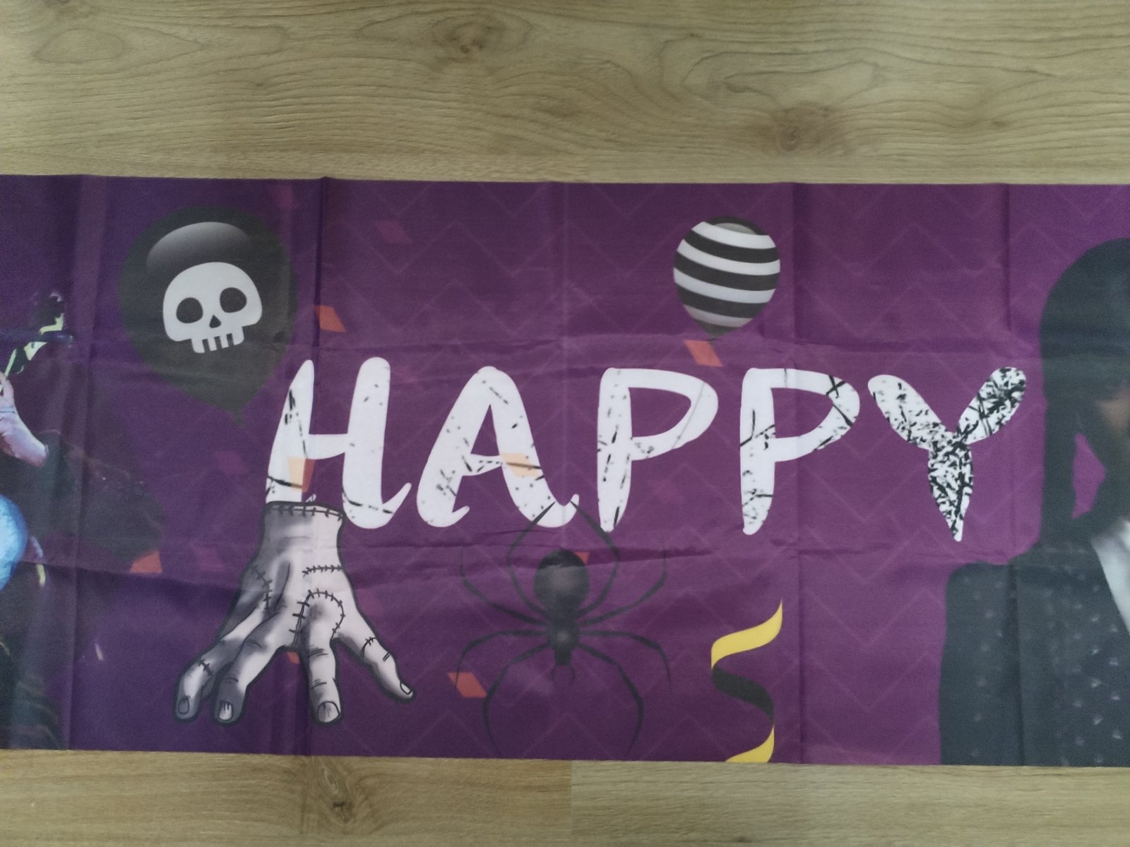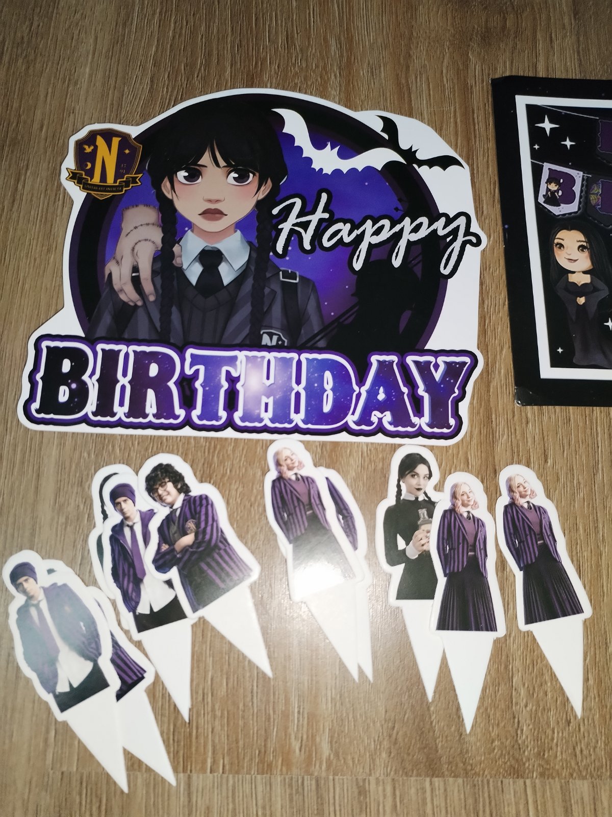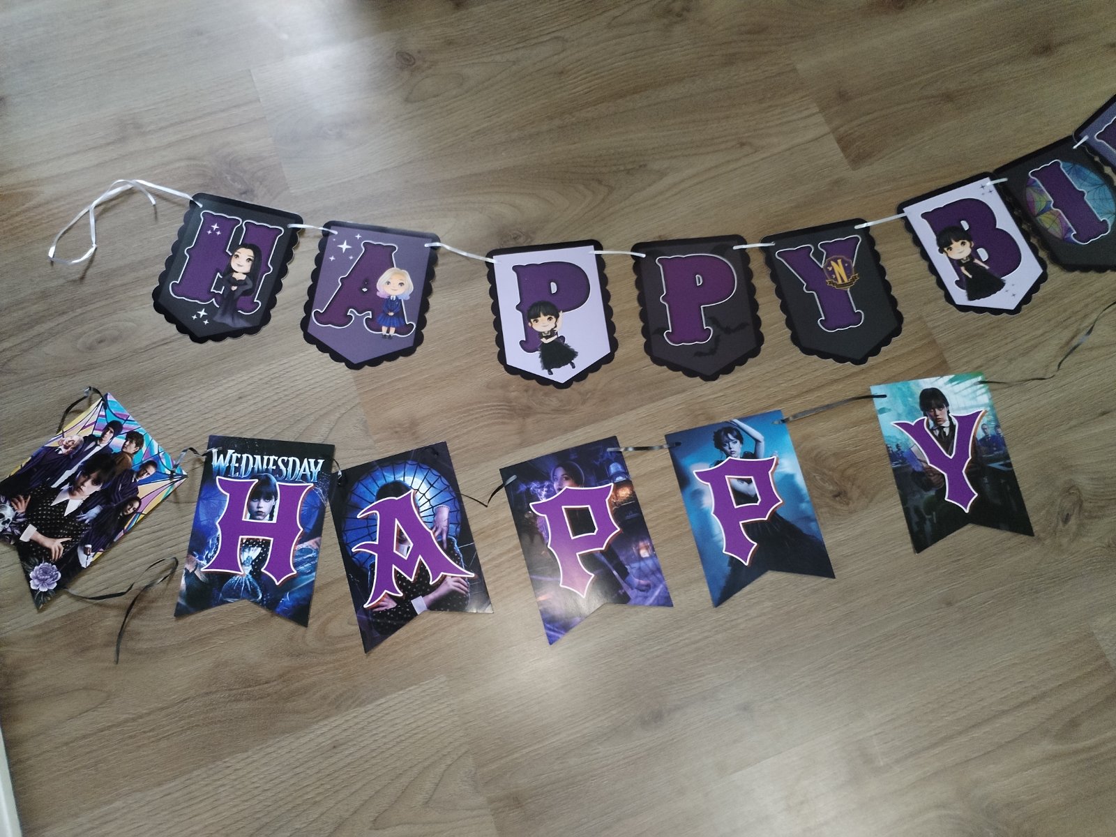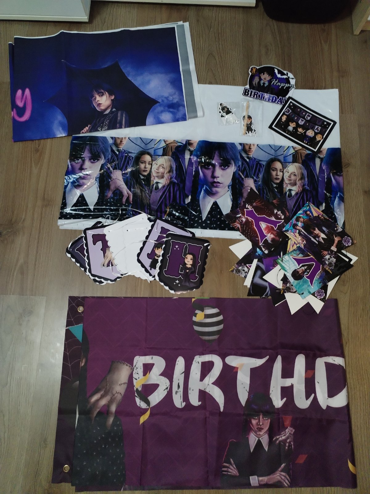 Nabízím narozeninovou výzdobu s tématem Wednesday, která obsahuje: ubrus 180x110 cm, transparent 305x50 cm, transparent 120x80 cm, 2x uvítací vlaječky cca 3 m, zápichy do zákusků (dortů), zvací karty. Použité pouze ubrus a uvítací vlaječky 1x, stav zánovního, ale použití zohledňuji v ceně. Cena kompletu 230 Kč
