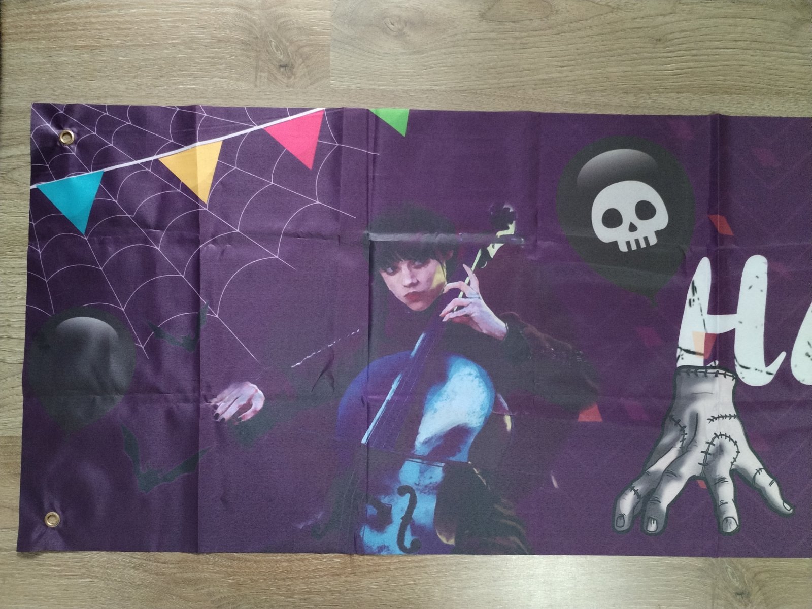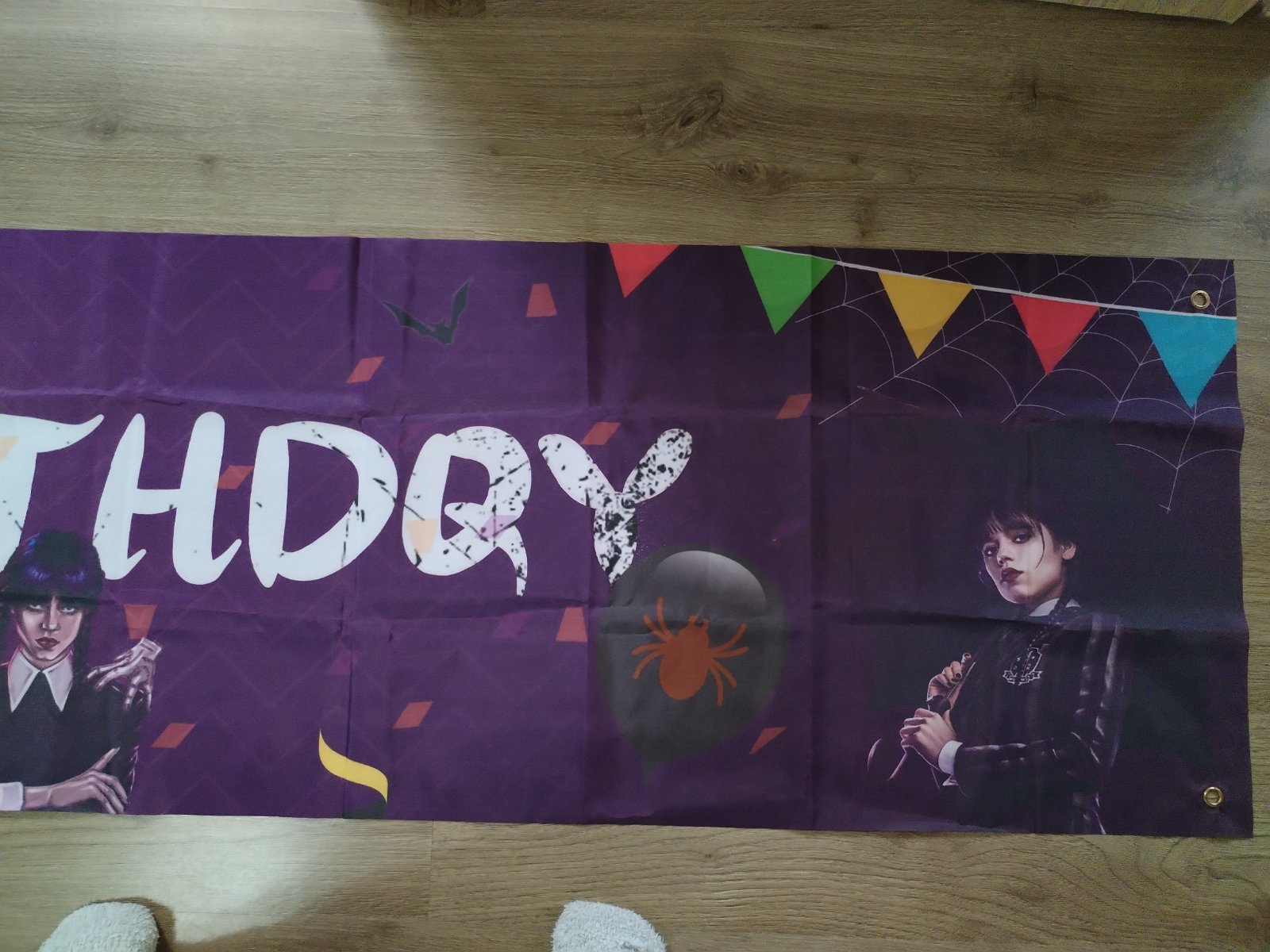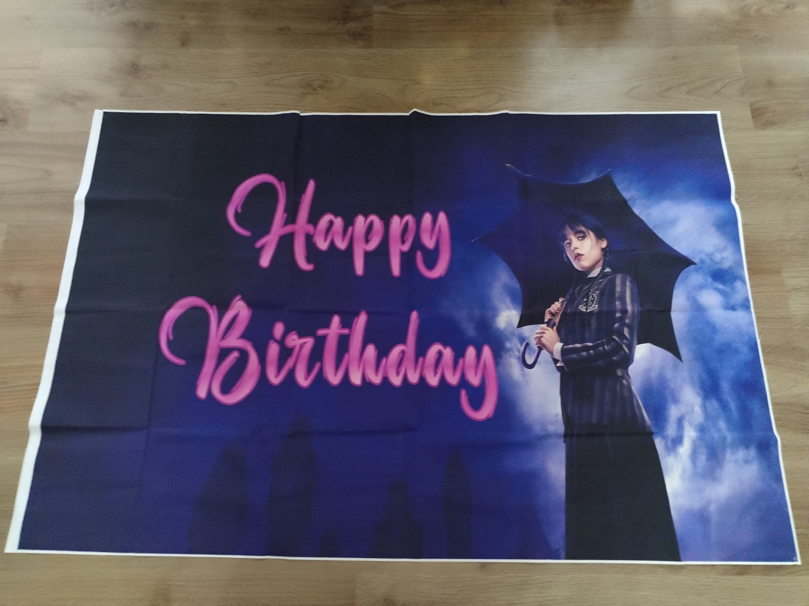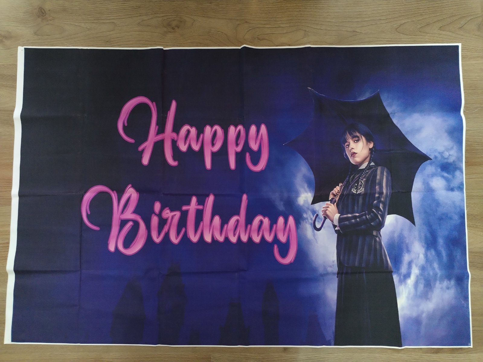 Nabízím narozeninovou výzdobu s tématem Wednesday, která obsahuje: ubrus 180x110 cm, transparent 305x50 cm, transparent 120x80 cm, 2x uvítací vlaječky cca 3 m, zápichy do zákusků (dortů), zvací karty. Použité pouze ubrus a uvítací vlaječky 1x, stav zánovního, ale použití zohledňuji v ceně. Cena kompletu 230 Kč