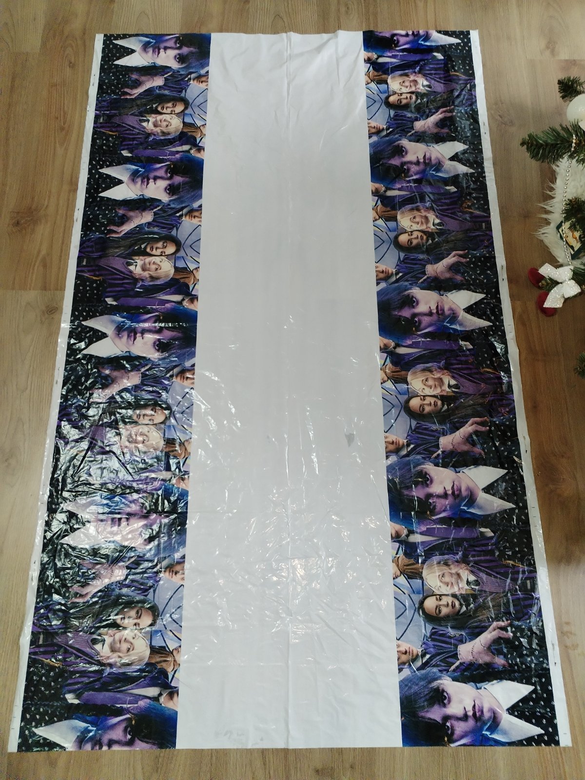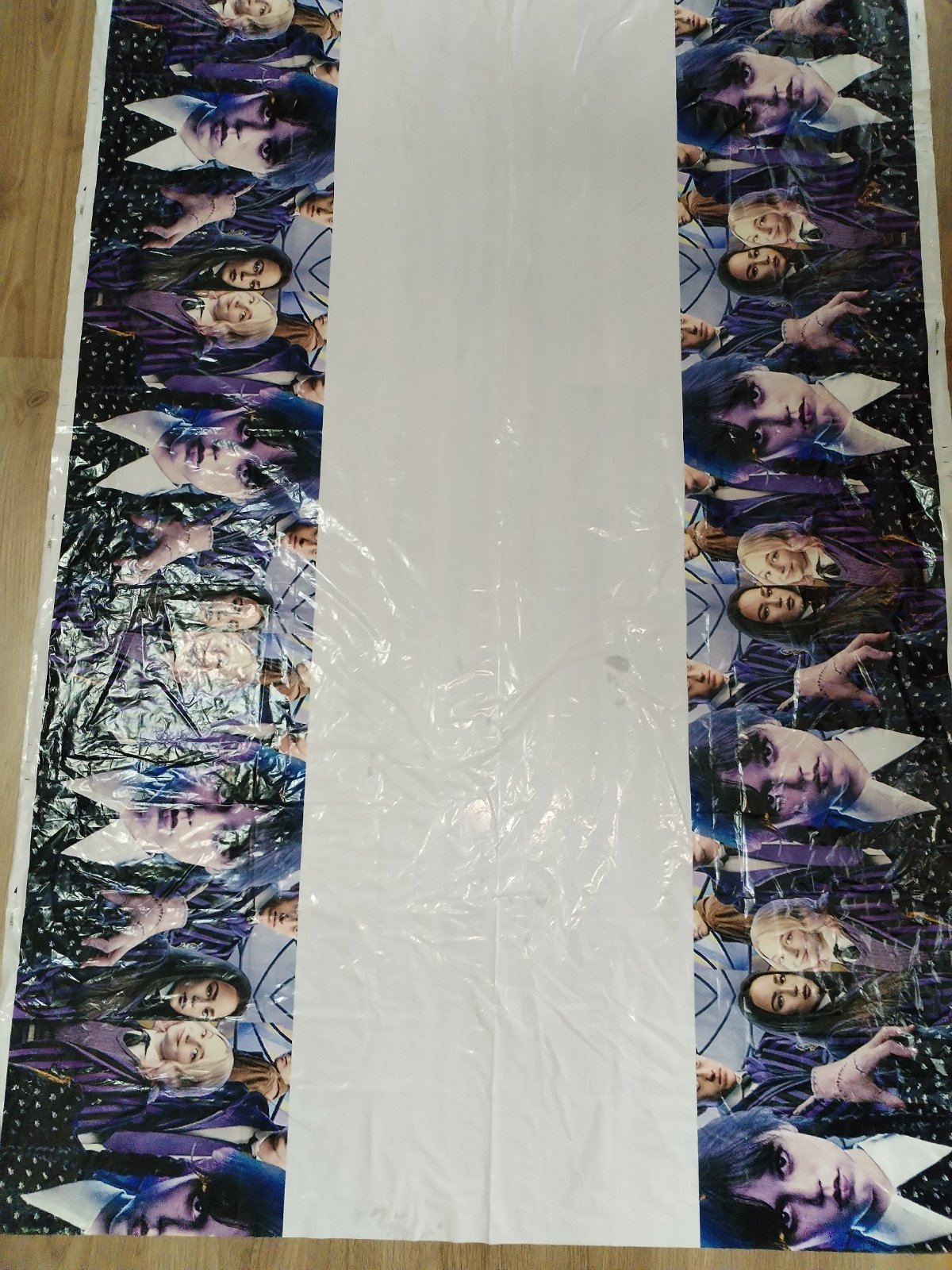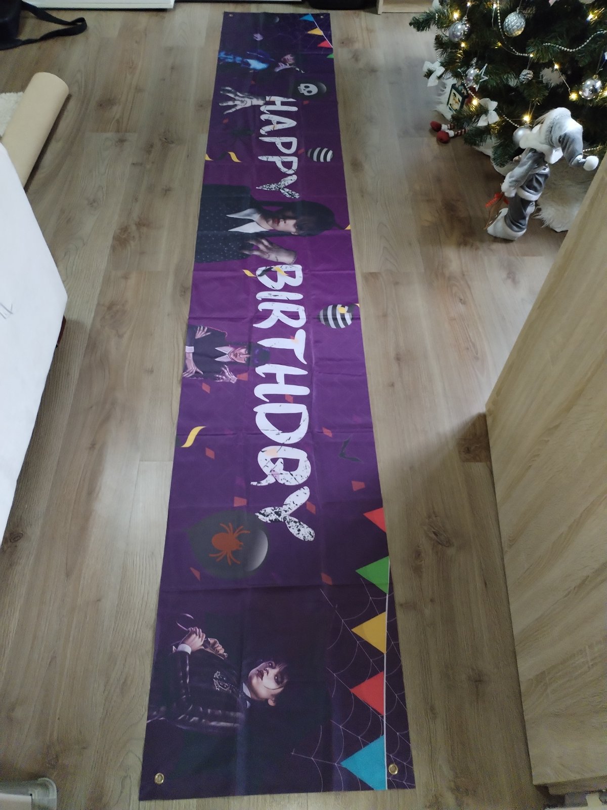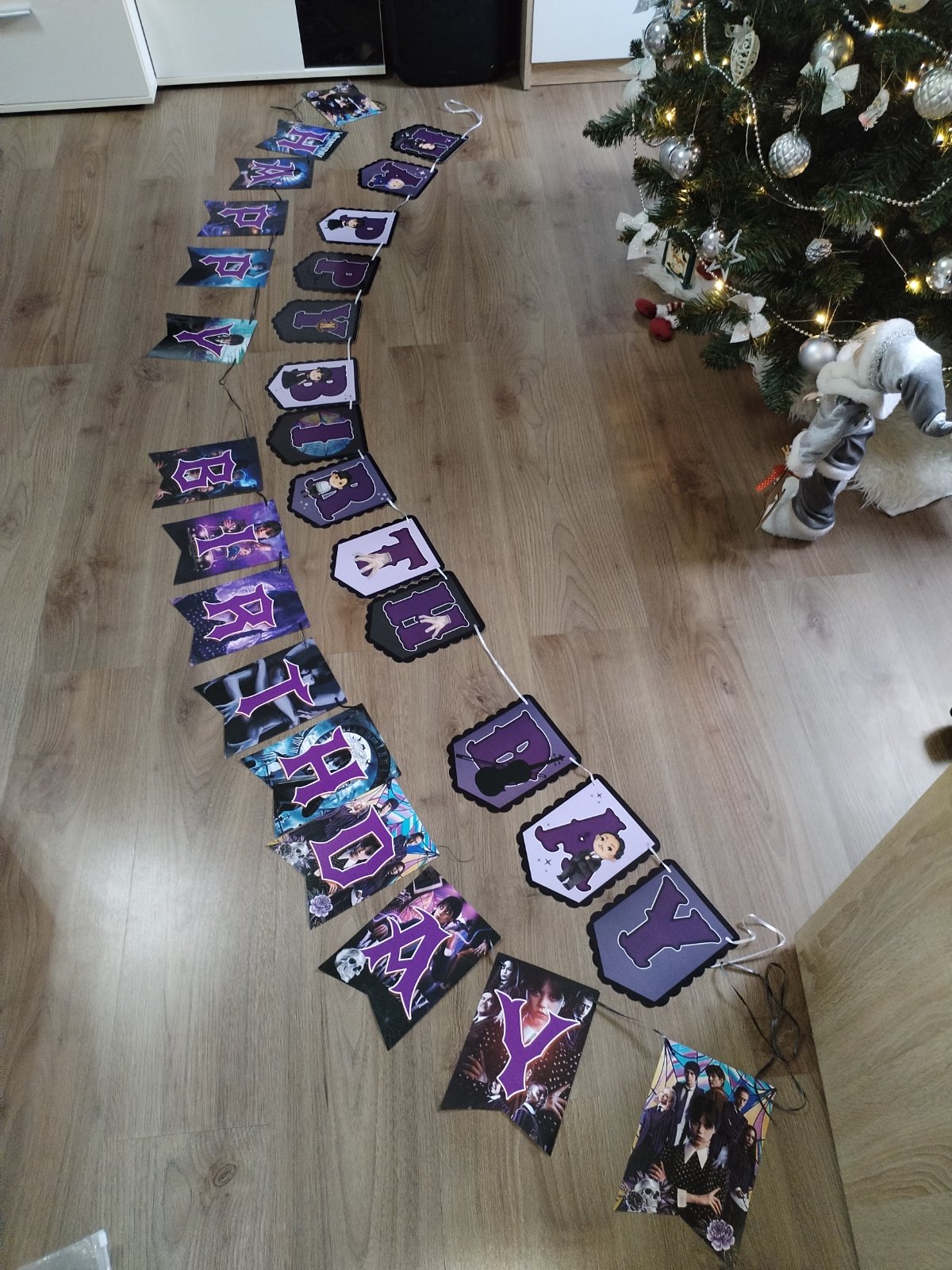 Nabízím narozeninovou výzdobu s tématem Wednesday, která obsahuje: ubrus 180x110 cm, transparent 305x50 cm, transparent 120x80 cm, 2x uvítací vlaječky cca 3 m, zápichy do zákusků (dortů), zvací karty. Použité pouze ubrus a uvítací vlaječky 1x, stav zánovního, ale použití zohledňuji v ceně. Cena kompletu 230 Kč
