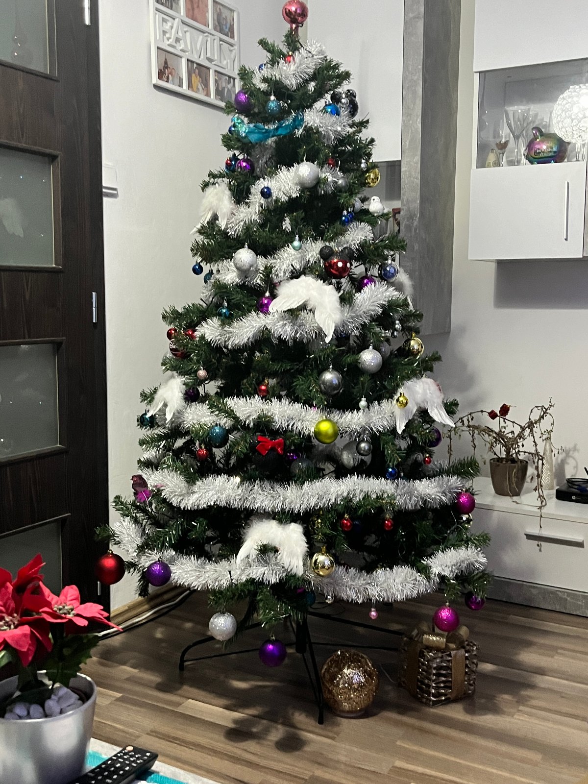 je starší, ale ještě poslouží a ozdobený nevypadá až tak zle (foto z loňska) na neozdobené fotce nejsou srovnané větve, je vyndaný narychlo až na focení, lze vyzvednout v Plzni