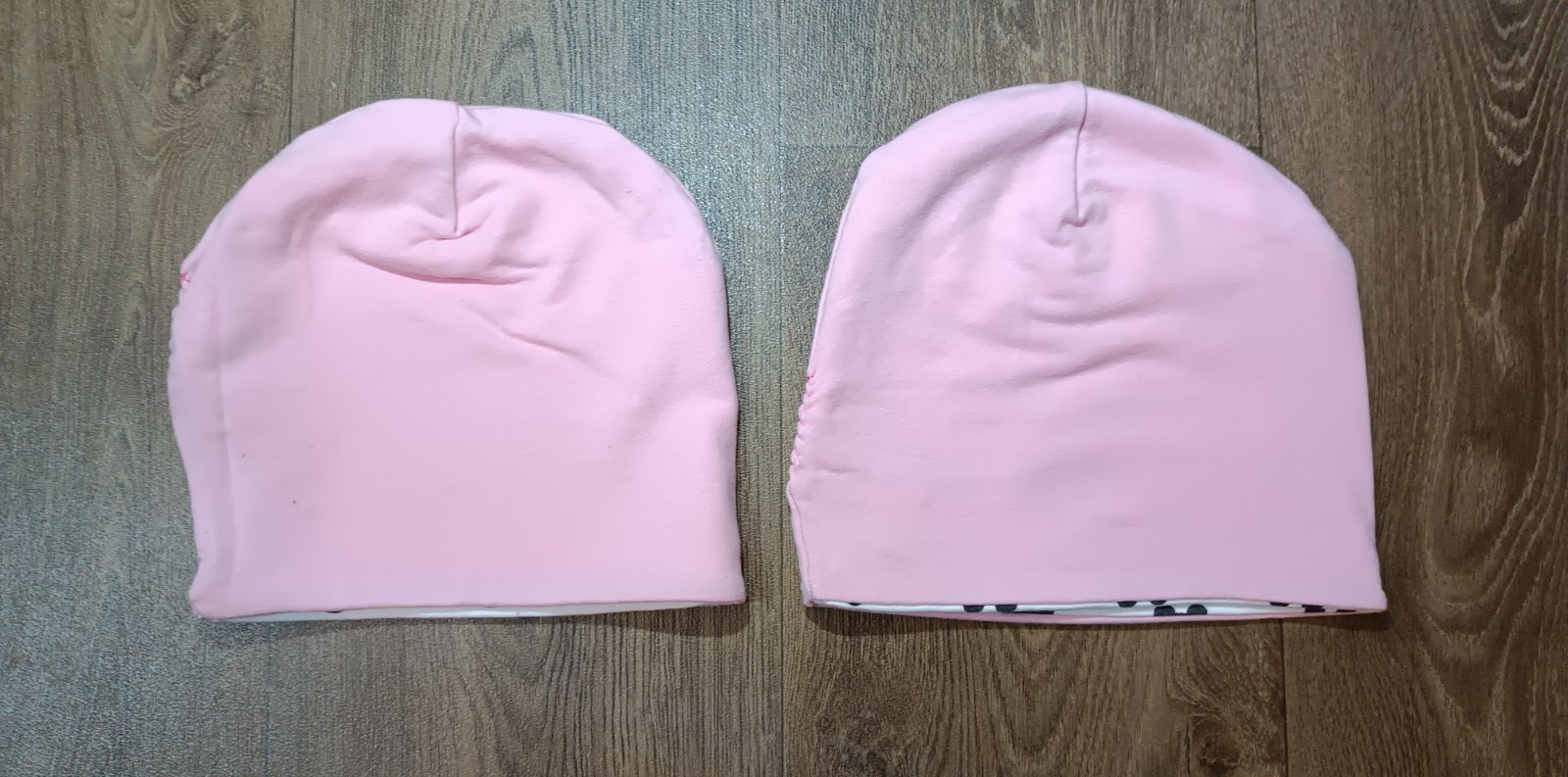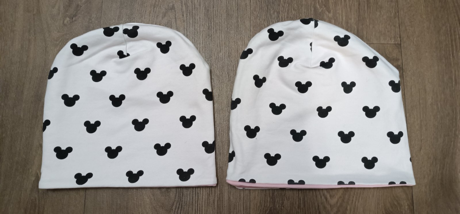 Prodám oboustranné jarní/podzimní bavlněné čepičky. Z jedné strany bílé s motivem myšky, z druhé strany světle růžové, šité na zakázku.