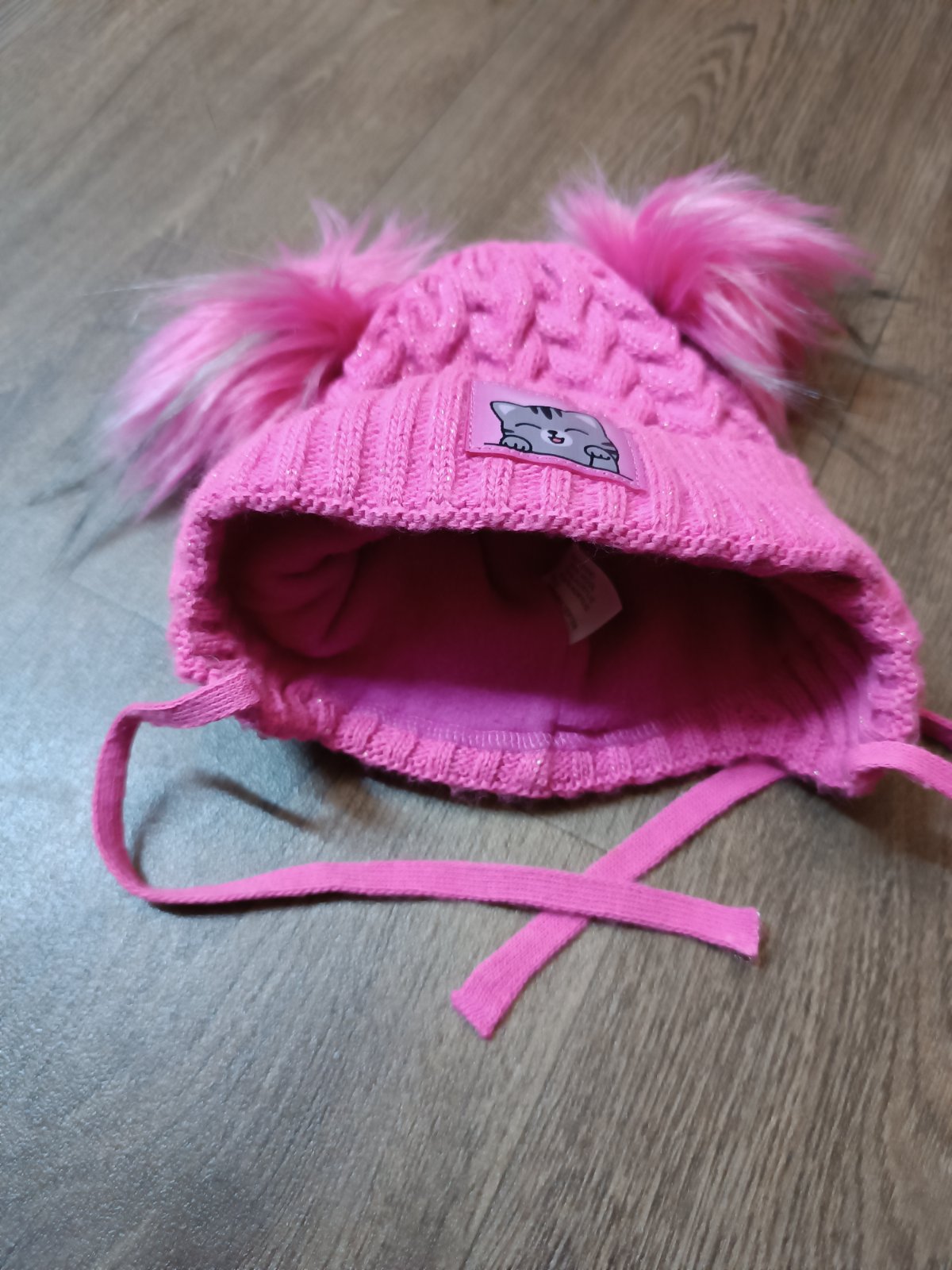 Nabízím dívčí zimní čepici zn. Ambra, vel. 80/86. Krásná růžová čepička s kočičkou, 2 střapce místo bambulí, třpytky, teploučká, nošená krátce, pěkný stav.