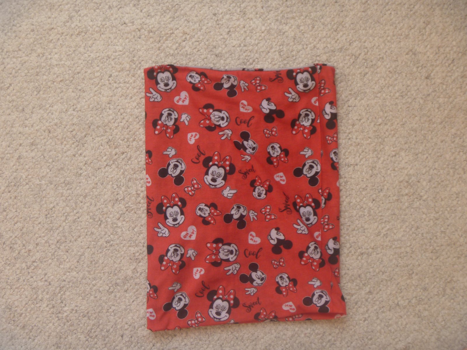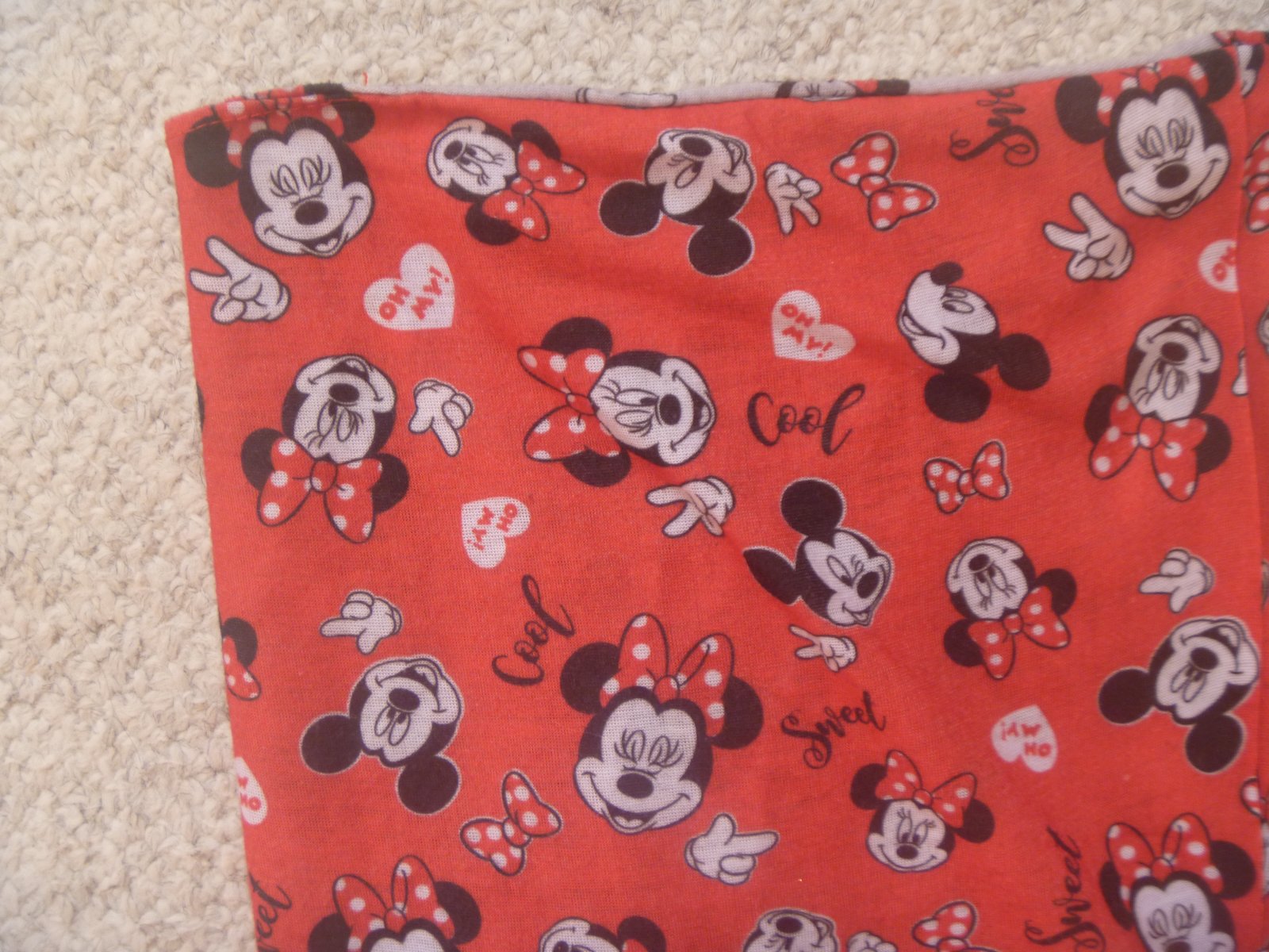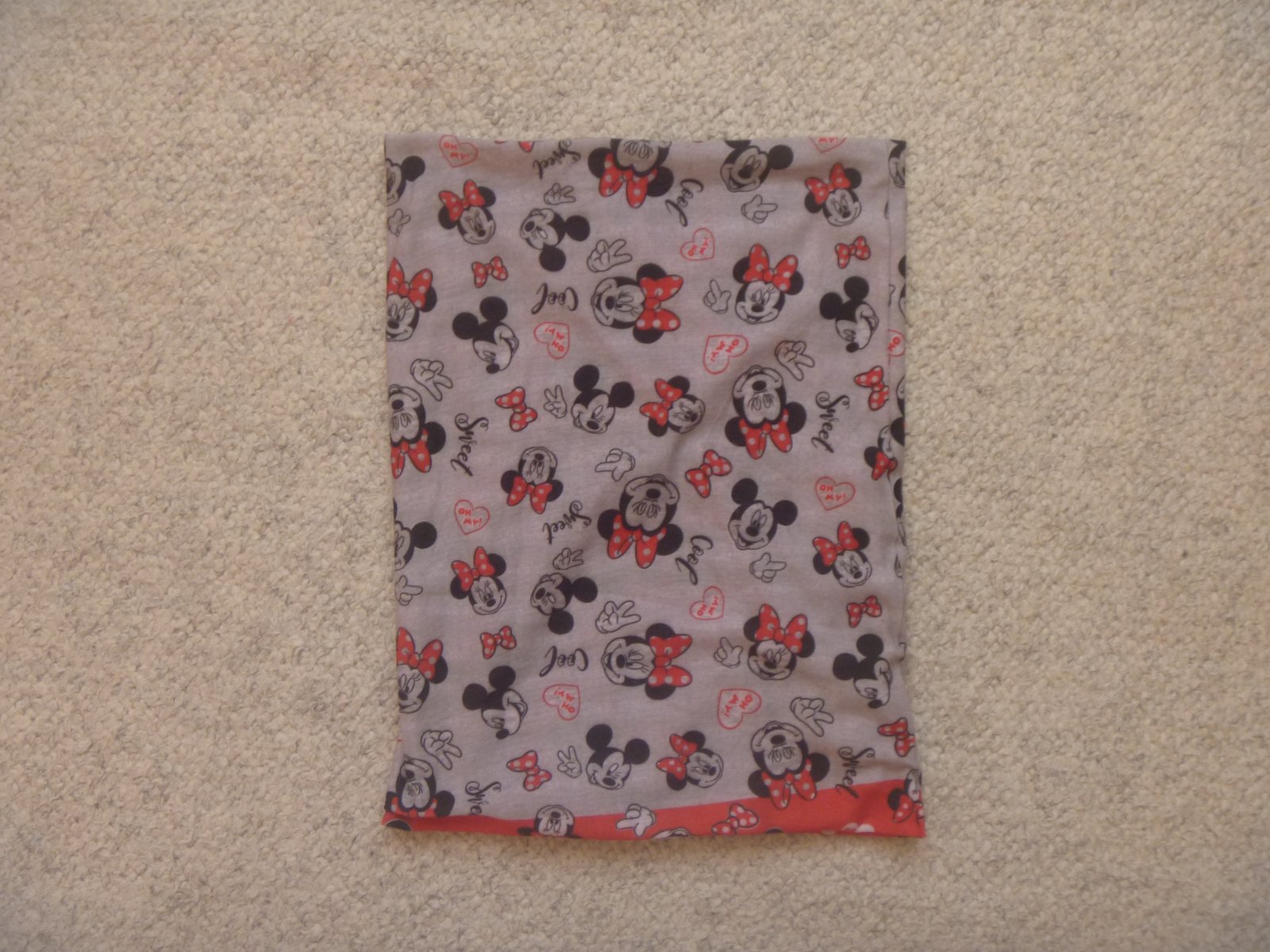 Prodám oboustranný nákrčník s Minnie a Mickey Mouse, jedna strana šedá, druhá světle červená, délka cca 32 cm, šířka 2x24 cm, dobrý stav.