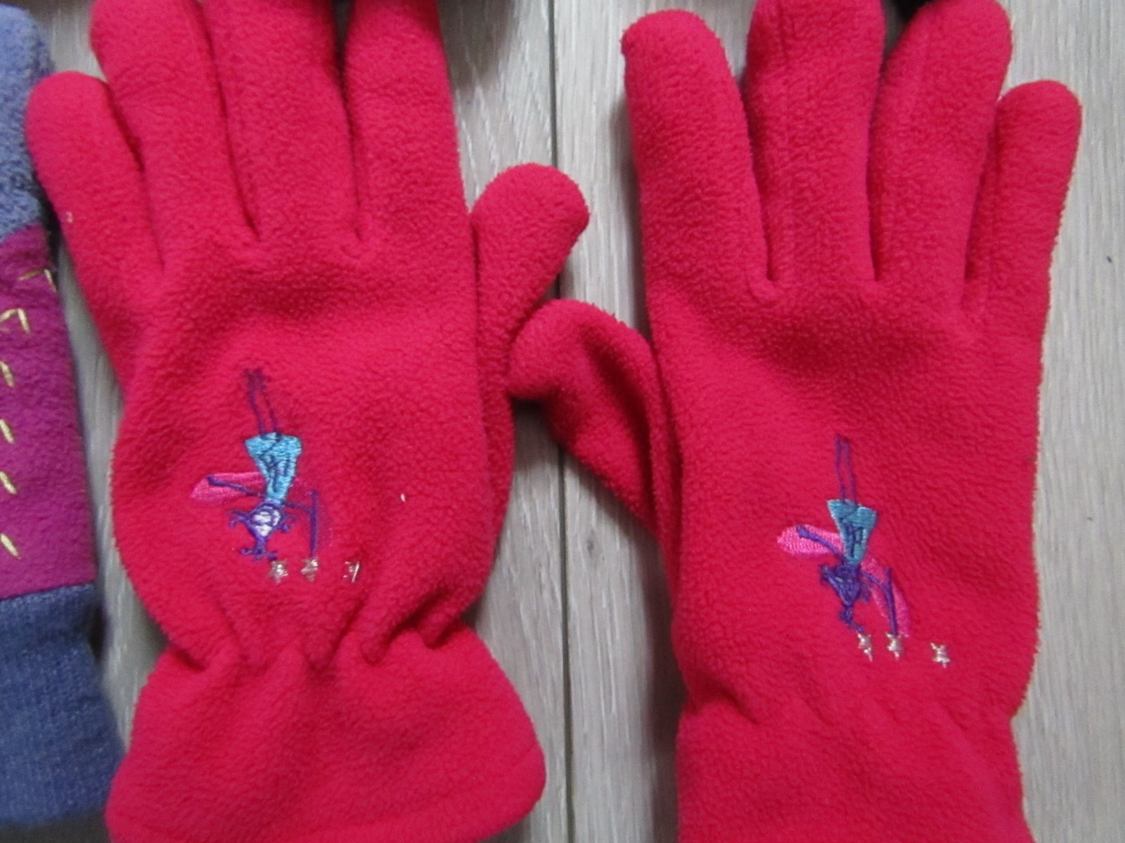 růžové flaušové s Vílou-délka je 21 cm,šířka u palce je 9 cm,délka rukavic od od horního okraje ke gumičce je 4,5 cm-cena 50 kč