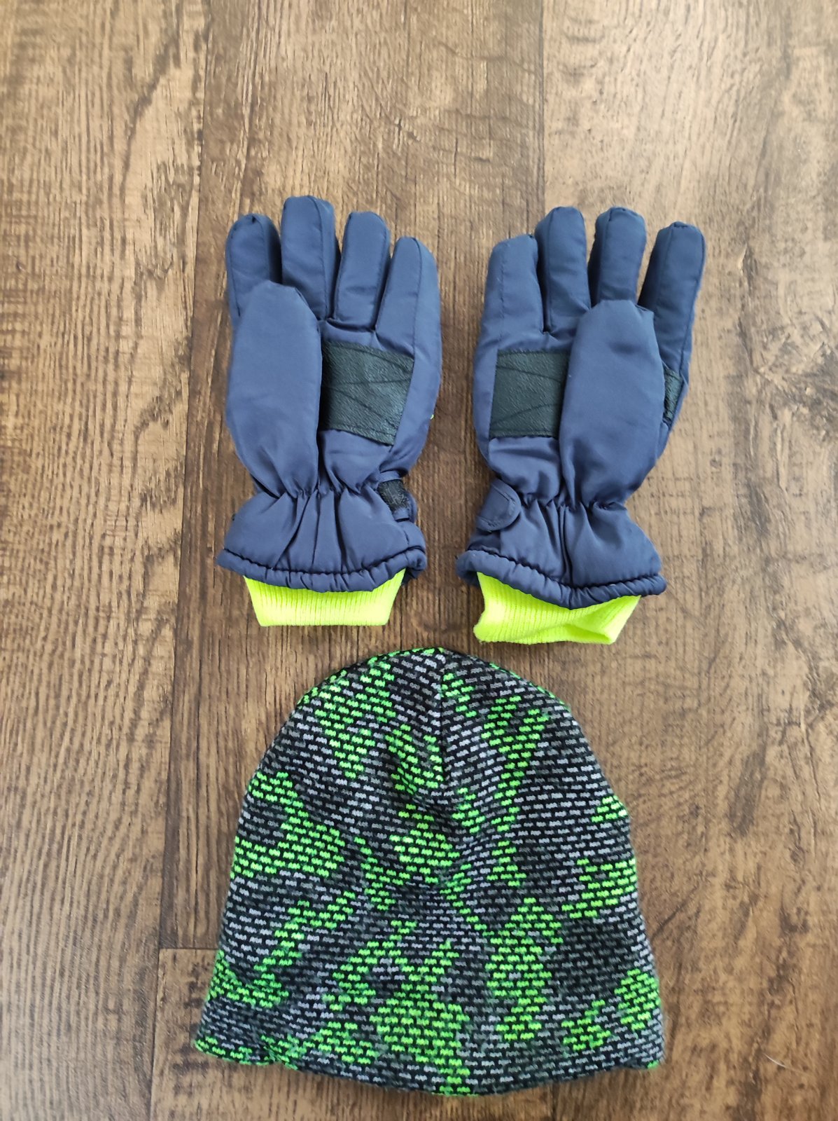 Zimní šusťákové rukavice a čepice. Cena za celý set. Syn nosil v období, kdy míval velikost 134. Barevně k sobě v reálu ladí více než na fotce - barvy tmavě modrá, šedá, svítivě zelená a čená. Čepice dost pruží a má fleecovou podšívku, rukavice nejsou úplně voděodolné (např. do sněhu), syn míval spíše do družiny.
