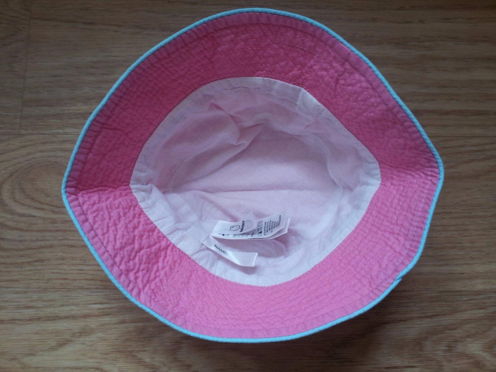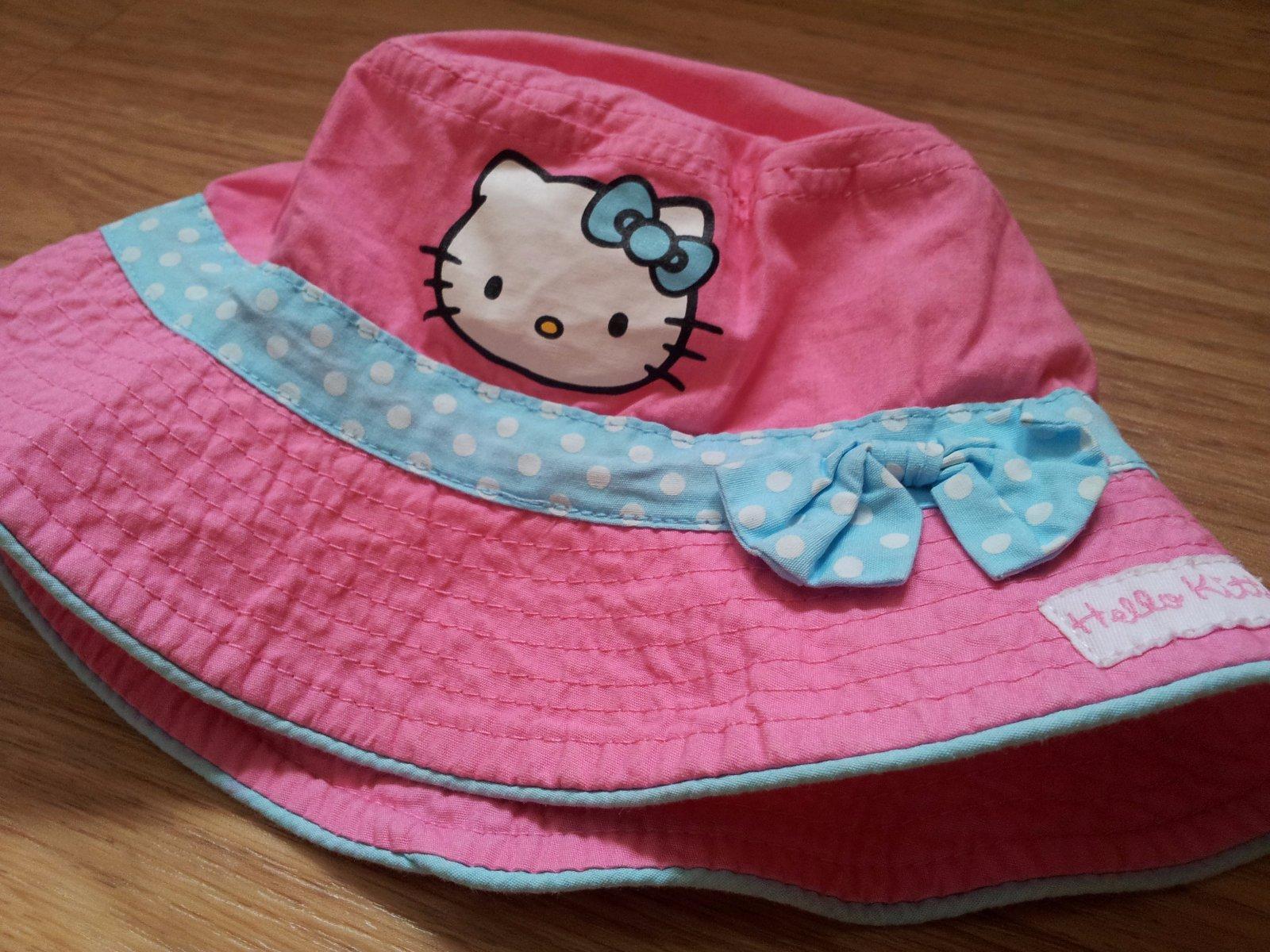Růžovo-modrý klobouček Hello Kitty, zn. H&M, vel. 86-98. Nošený min., koupený pozdě, jemný žmolík na podšívce.