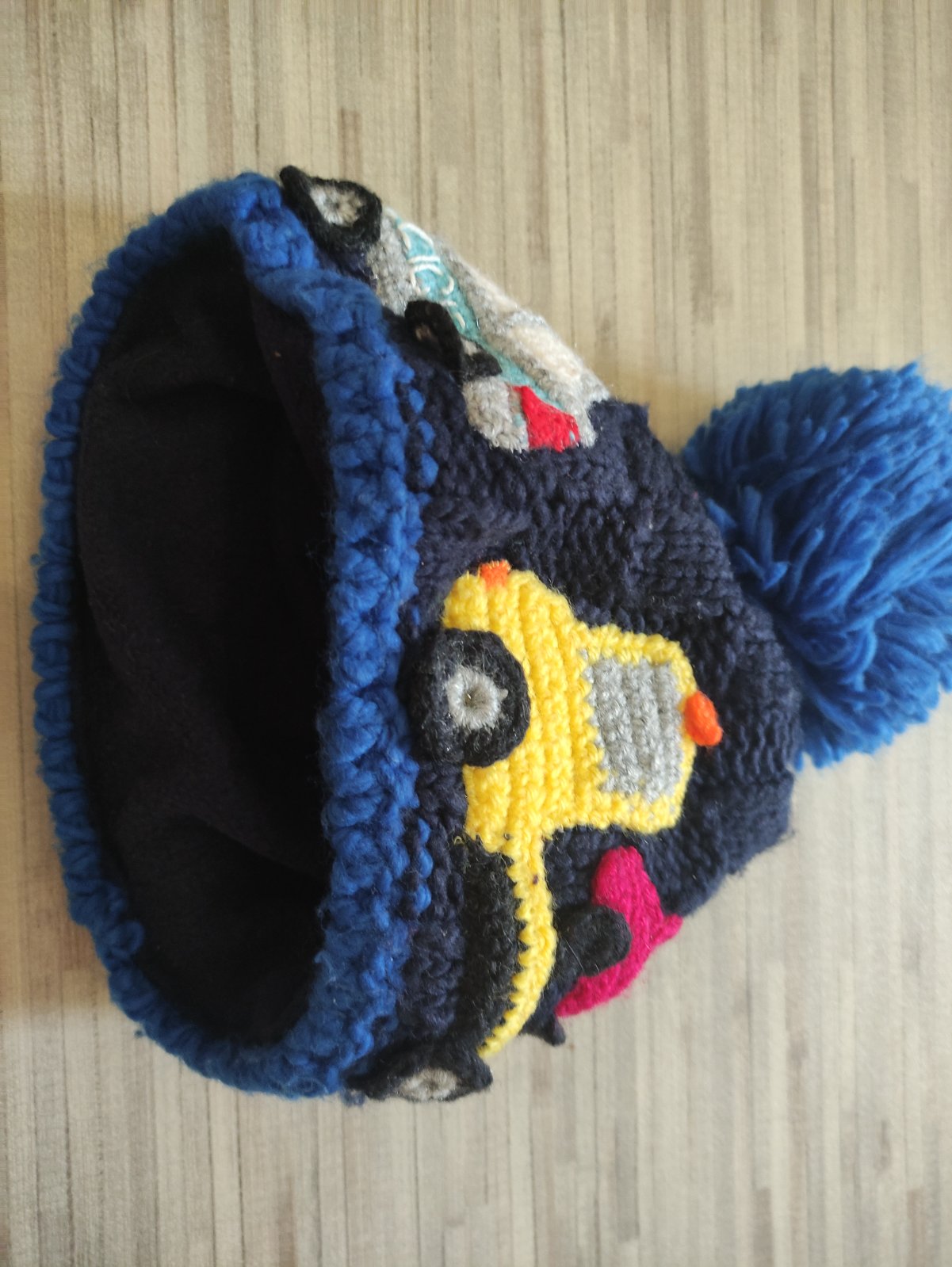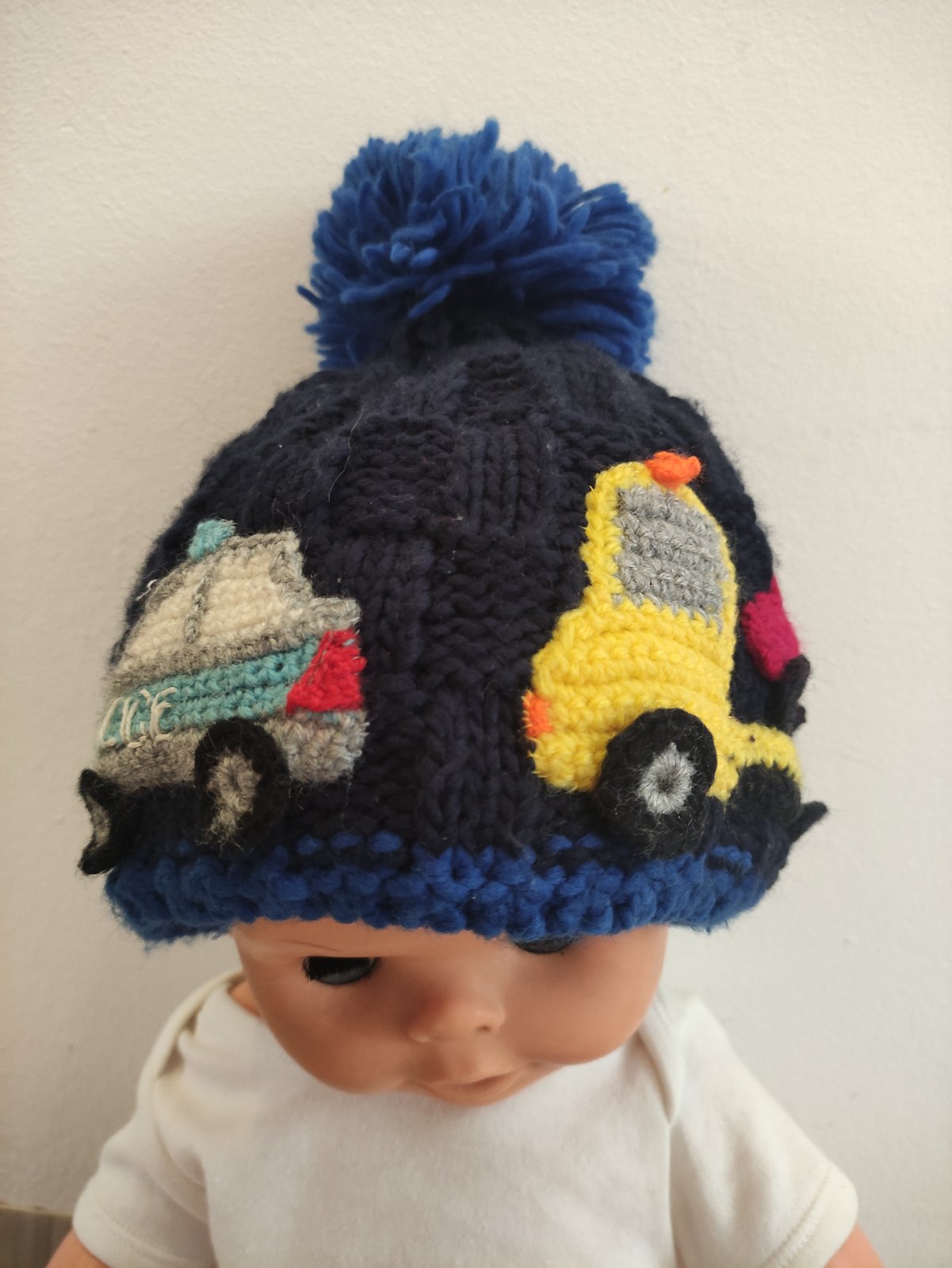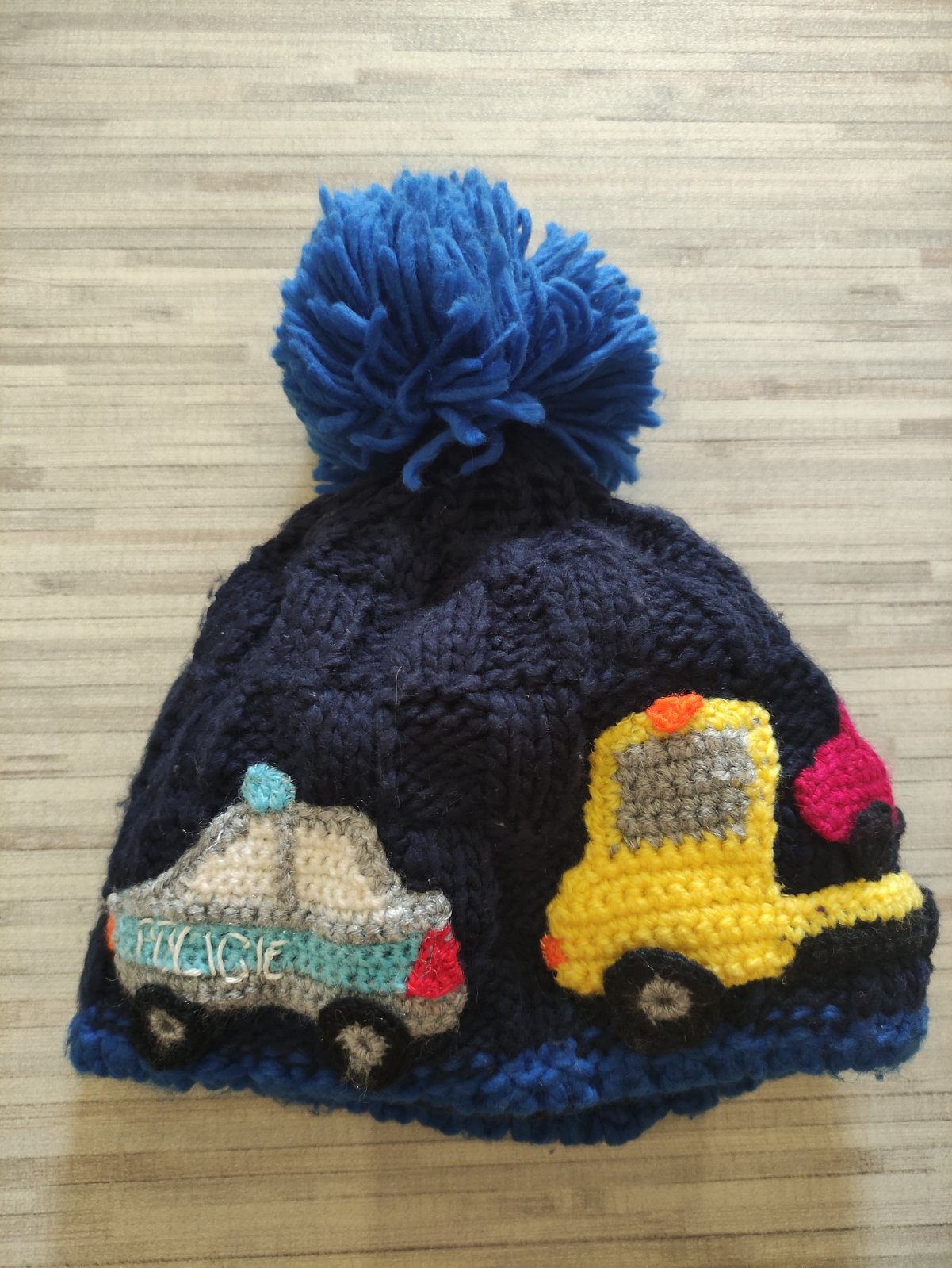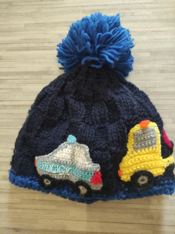 Čepice s háčkovaným policejním autem a odtahovkou, velikost odhaduji na 2 roky. Možné osobní předání v Brně Bystrci a okolí.