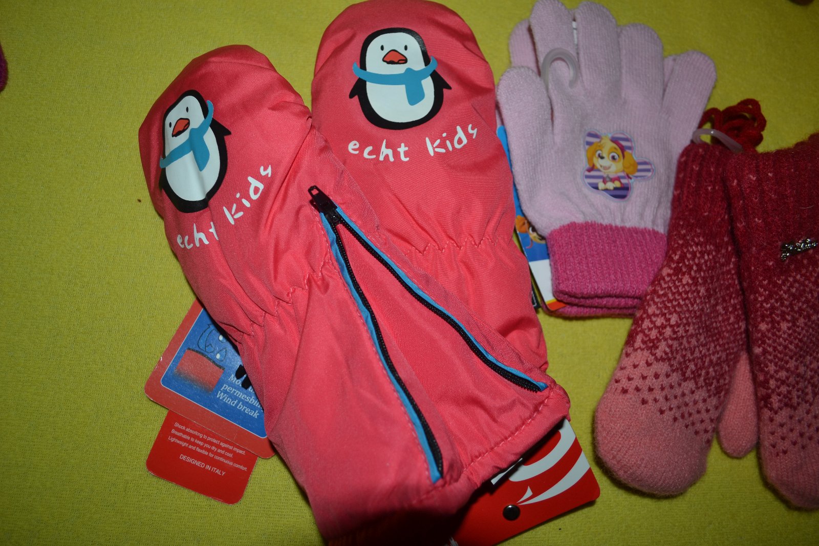 3x rukavice: prodloužené silné šusťákové, zesílené dlaně,rychle a pohodlně se oblékají díky zipu, další jsou strečové úpletové,pružné,další velmi silné úpletové,na 4-6 let,tato zvýhodněná cena je za všechy 3 věci celkem