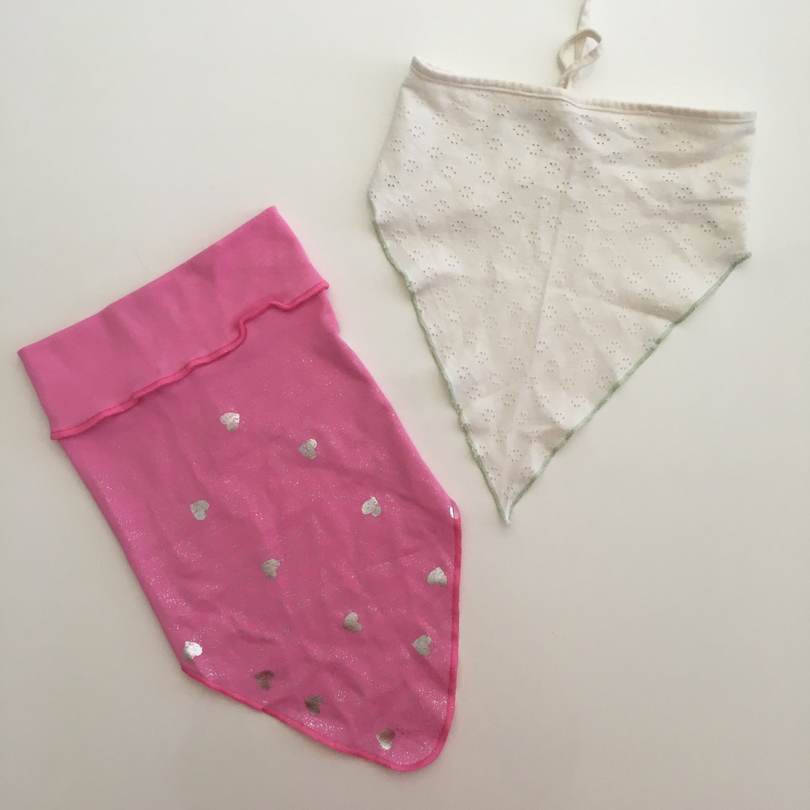 Růžový úpletový se stříbrnými srdíčky - nenošený, šířka přes hlavu 2 x 19 cm; cena 150 Kč.