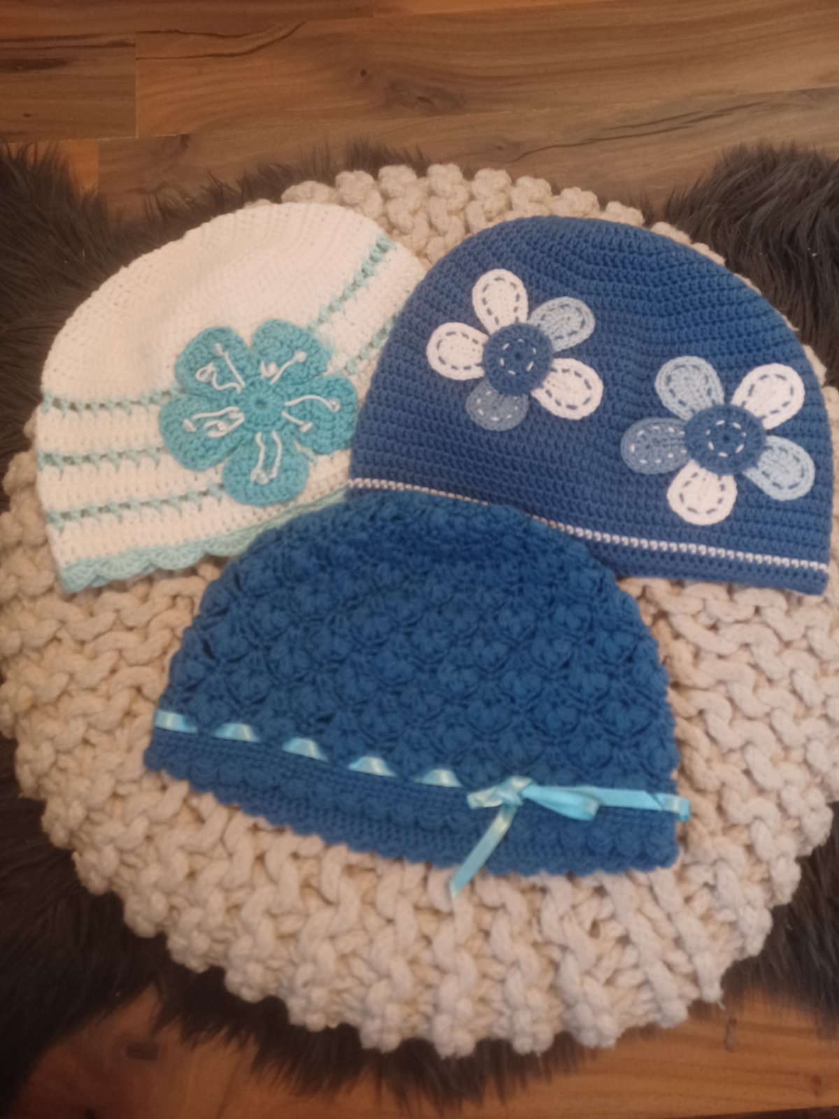 3krát háčkovaná čepička dělaná na zakázku, dle dcery na 2-4 roky, nošené na střídačku. Cena celkem nebo s dvěma kytičkami 130, modrá s mašličkou 100, bílá 80.