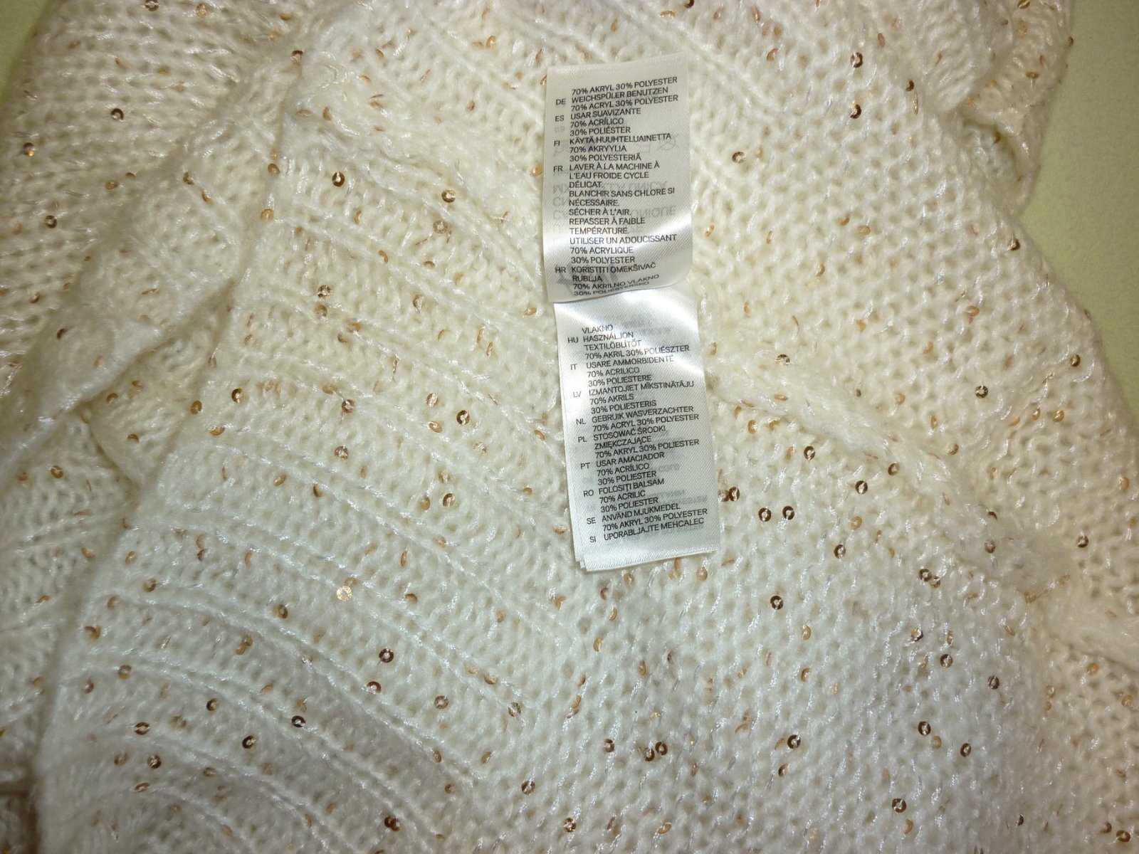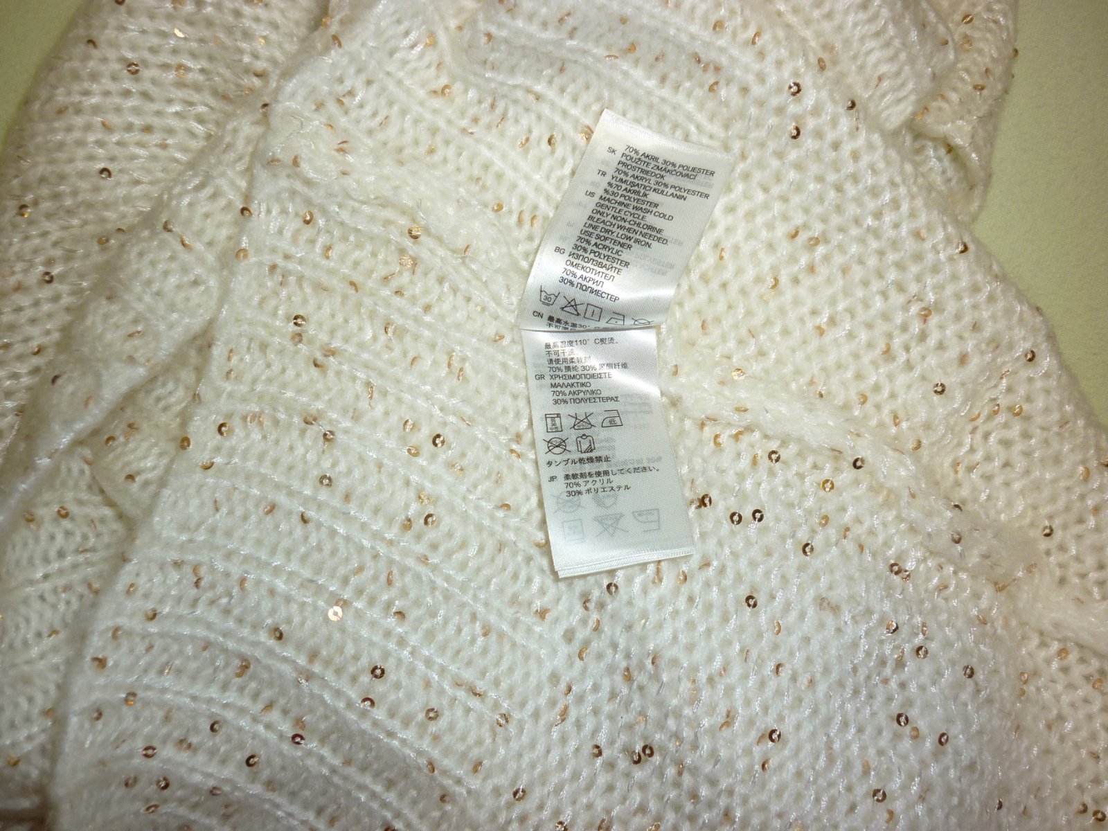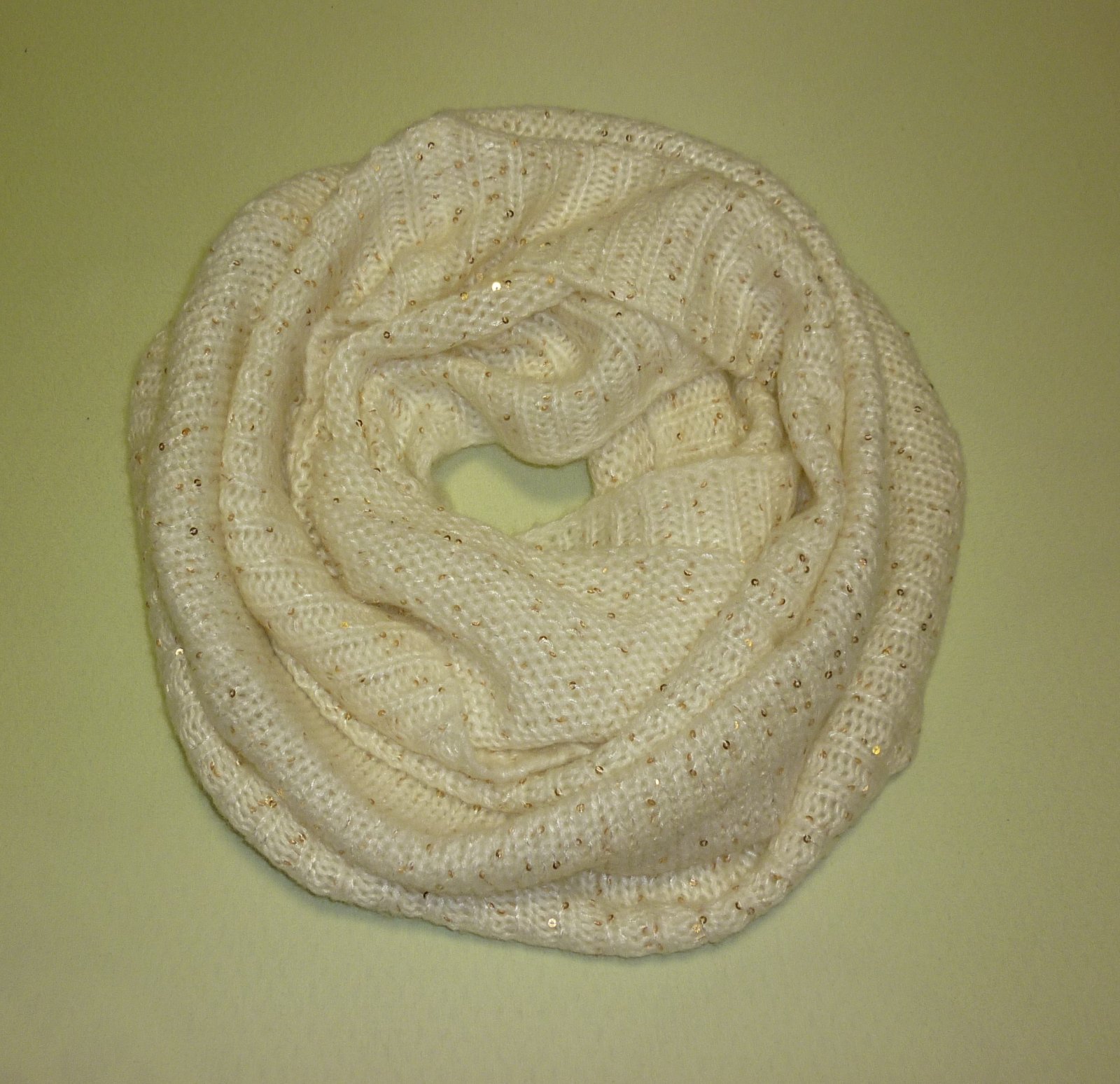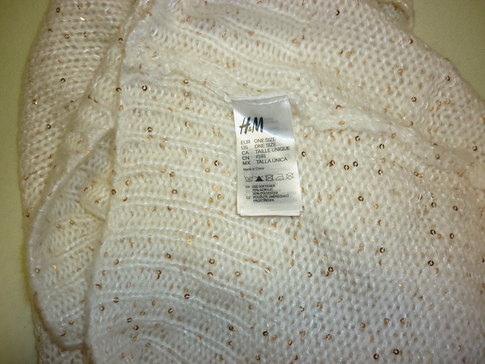 Prodám krémový tunel se zlatými flitry H&M, nošený, ve velmi dobrém stavu. Materiál: 70% akryl a 30% polyester. Univerzální velikost. Cena: 90,-Kč + poštovné. Koukněte na moje další inzeráty, třeba si něco vyberete a ušetříte na poštovném. Tel.: 728 455 567