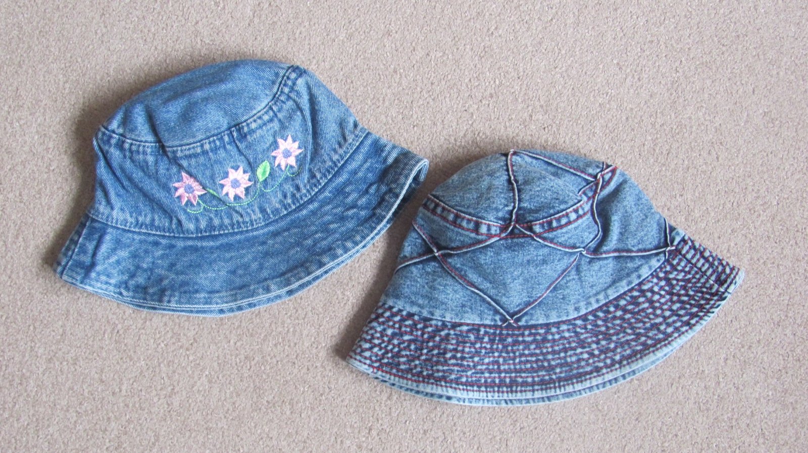 Dívčí riflové kloboučky, 2 ks, s červeným prošitím velikost 56 (M), s květinami trošku menší.