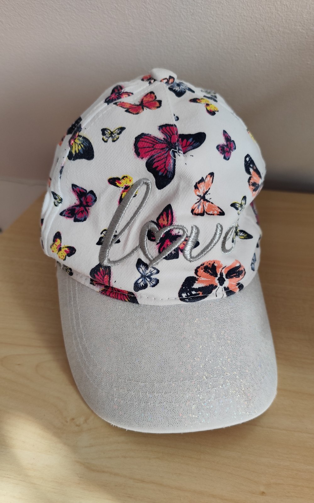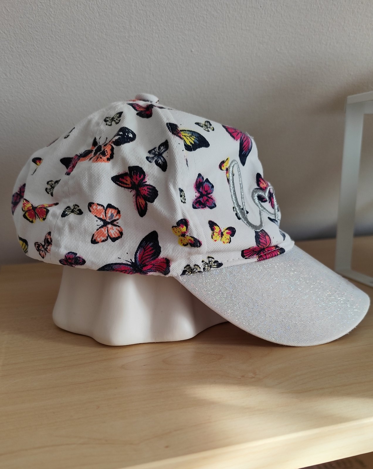 Dívčí kšiltovka bílá s motýlky - vel. 134-176, zakoupeno v Takku. Vzadu redukce. Cena 50 Kč