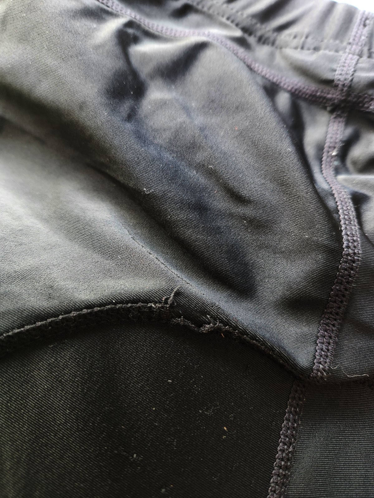 Detail: zatrhané nitky na boku kalhot, 1cm porušené prošití na zadku