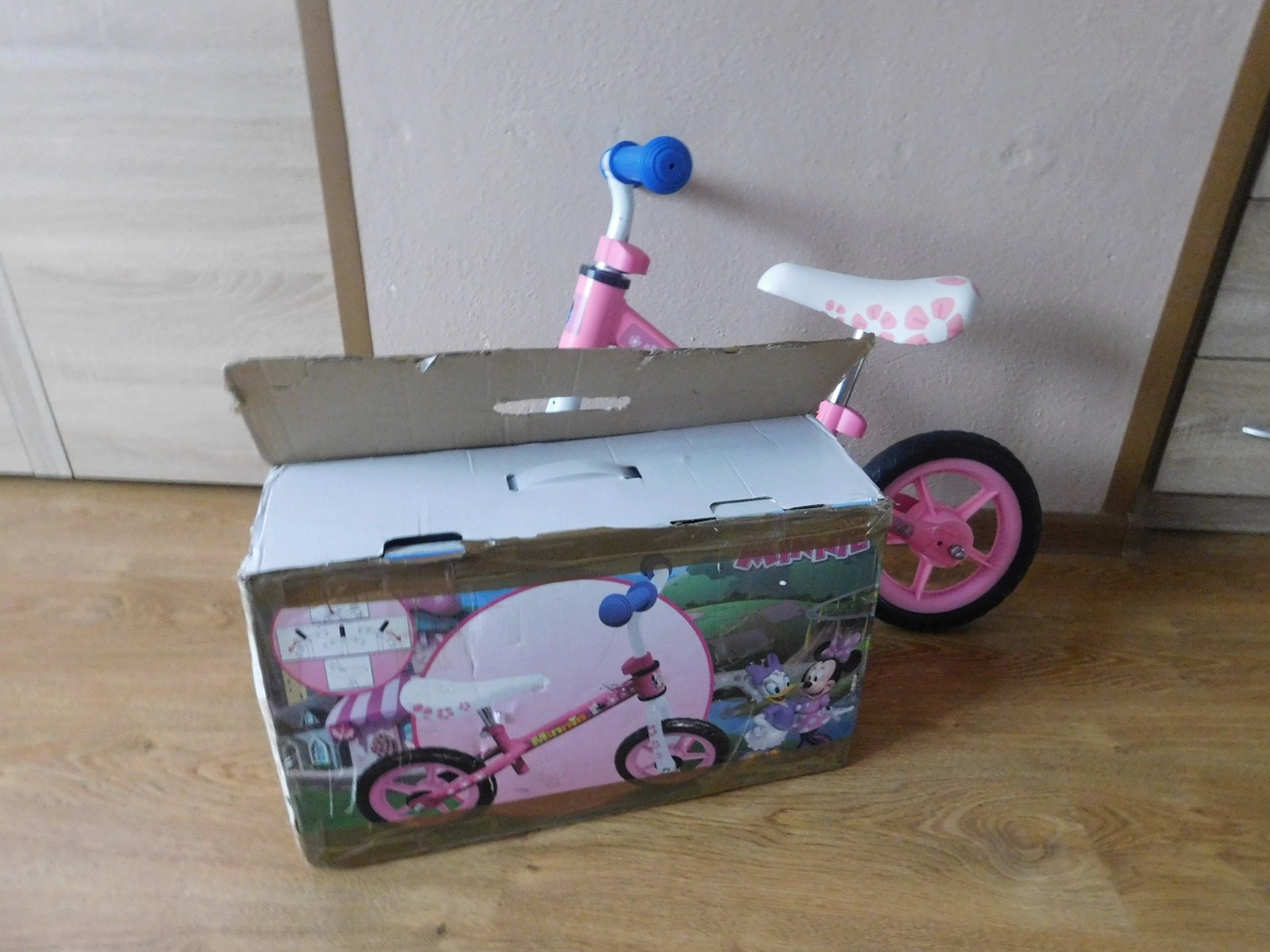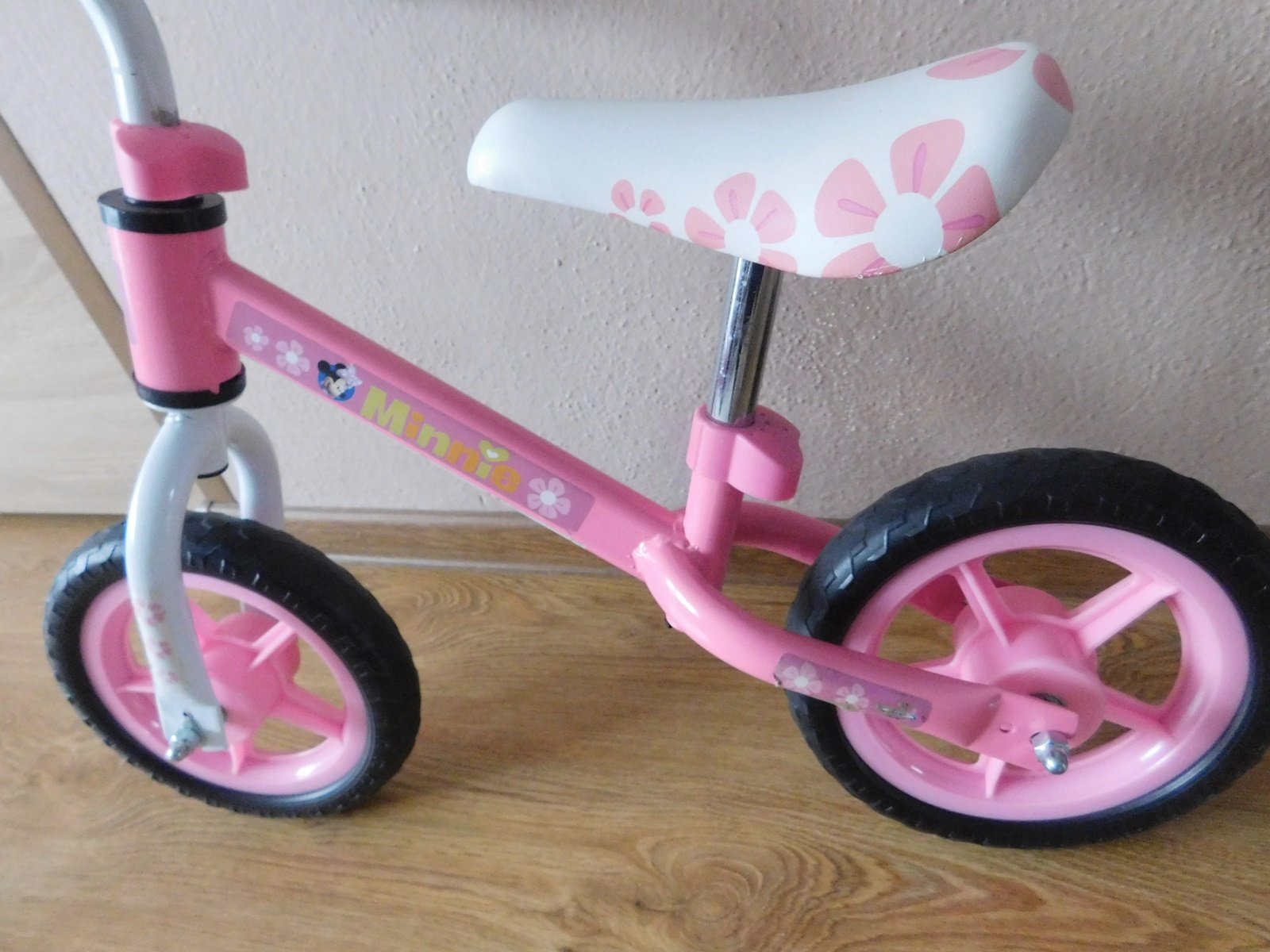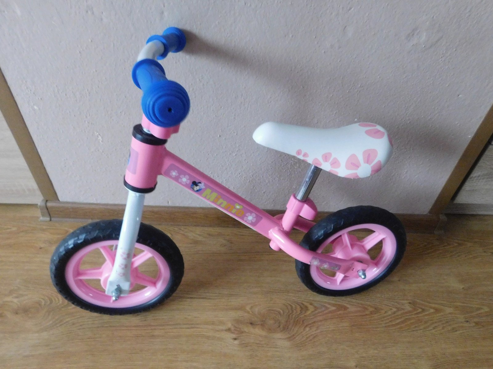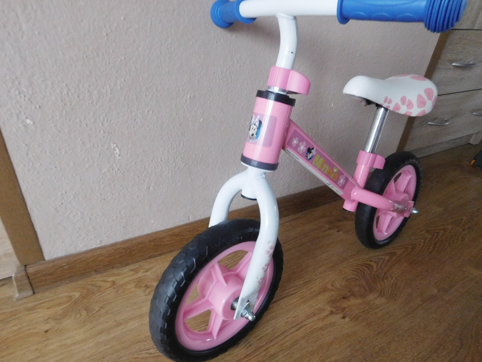 s Minnie,ocelový rám,pneumatiky odolné proti propíchnutí,protiskluzové rukojeti,pěnové pohodlné sedlo,nastavitelné sedlo i řidítka,max váha dítěte 20kg,ježděno pouze krátce a jen doma,přesto jsou místy oděrky,dodáno v demontu,v orig.krabici