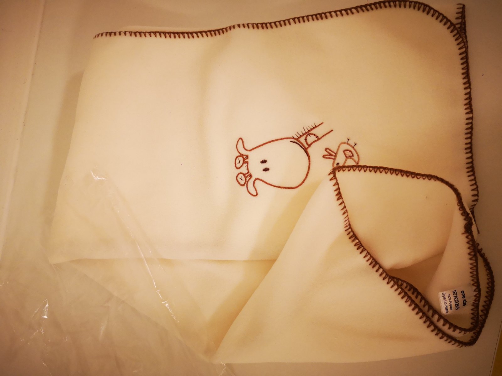 Velice jemná froté dečka, rozměr cca 93x93 cm. Koupená myslím v IKEI, ale nejsem si jistá. Medvídek má prací chloupek (viz. foto). Lehce zažloutlá mapka v levém dolním rohu (viz. úvodní foto).