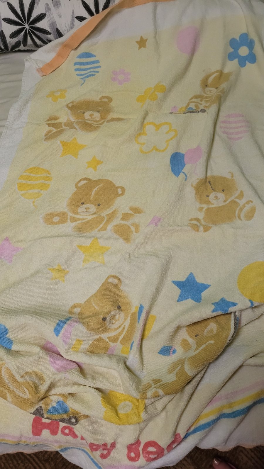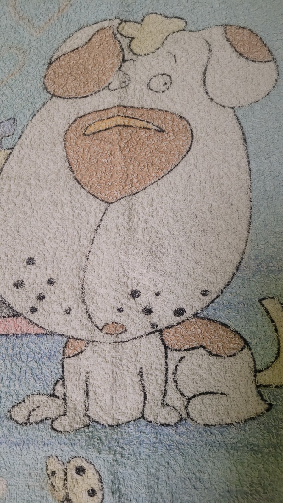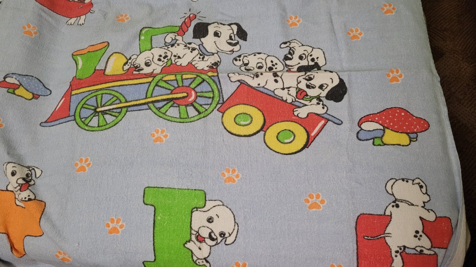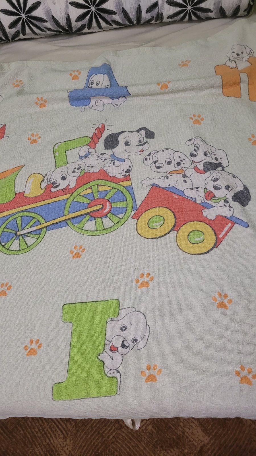 Žlutá s medvídky 71 x 138cm. Zelená s dalmatiny je více používaná, rozměry 100 x 96cm. Modrá s dalmatiny 102 x 98 cm.