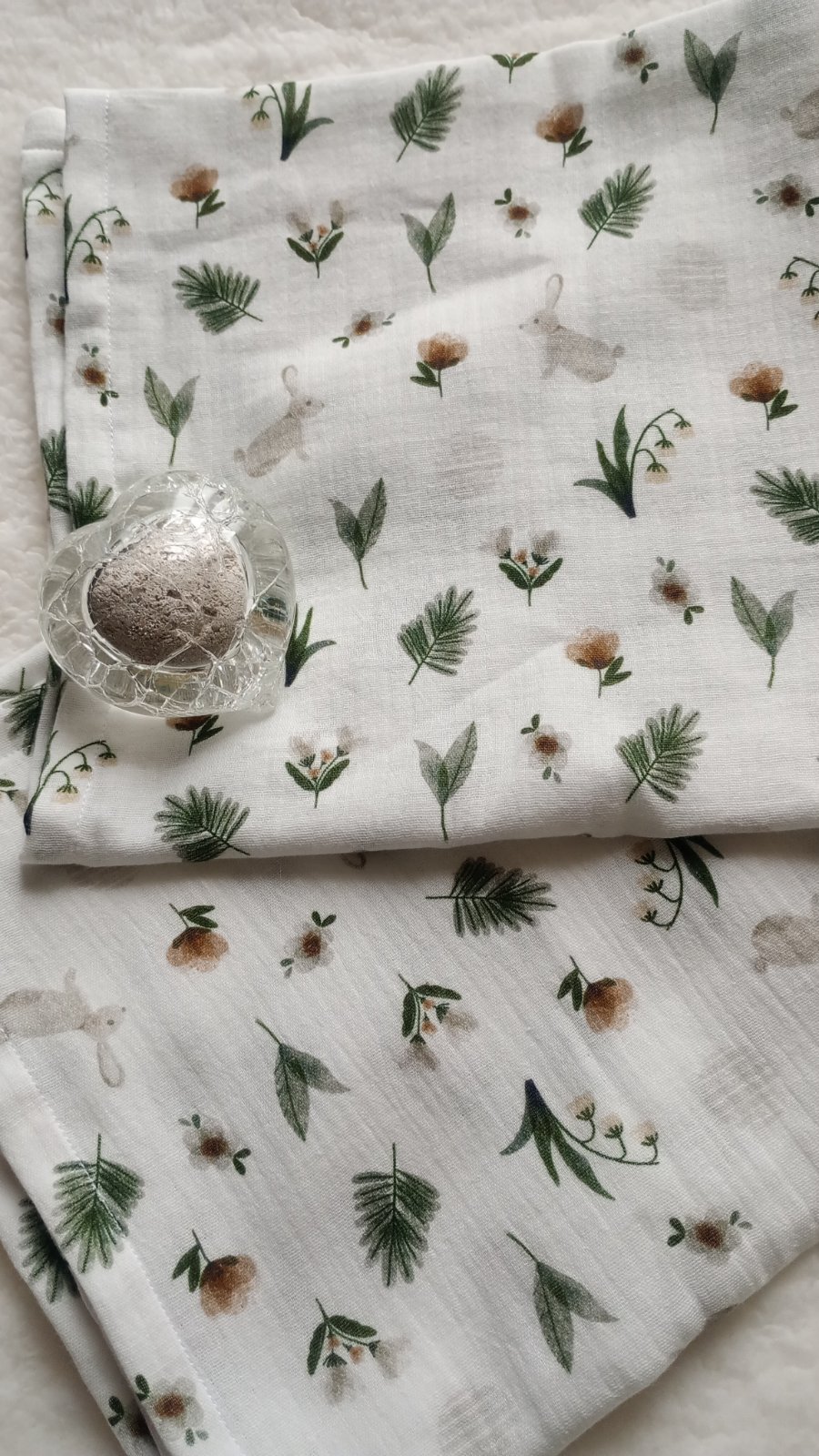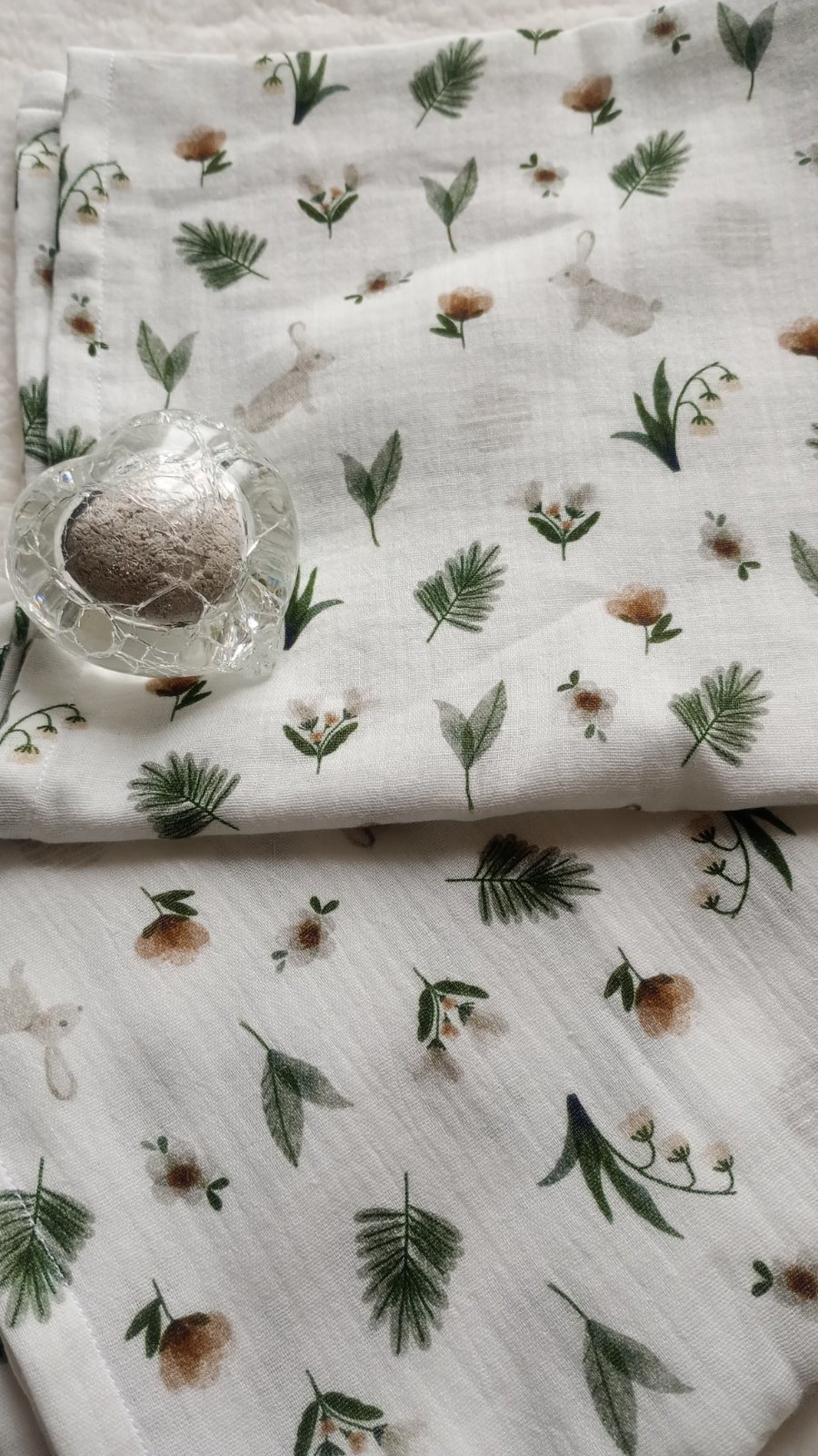 Krásná mušelínová osuška z organické bavlny s motivem zajíčků a konvalinky. Materiál s certifikací GOTS.