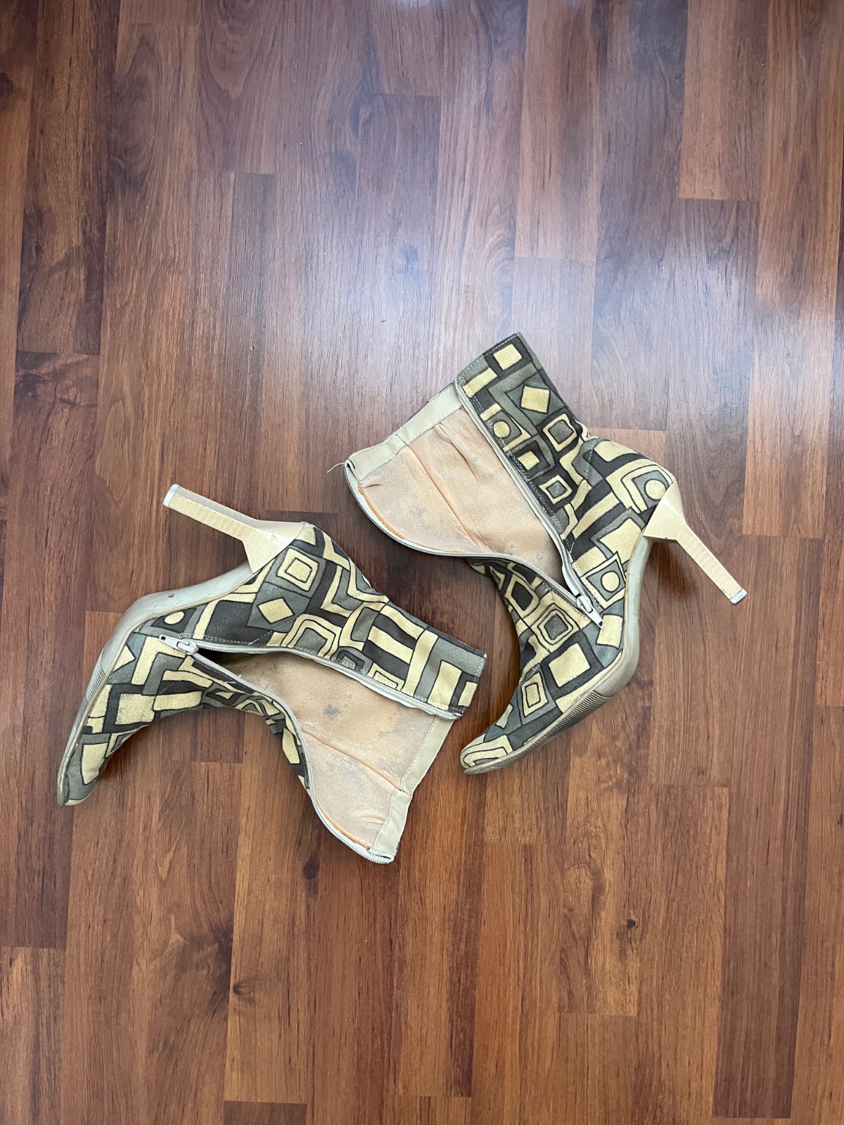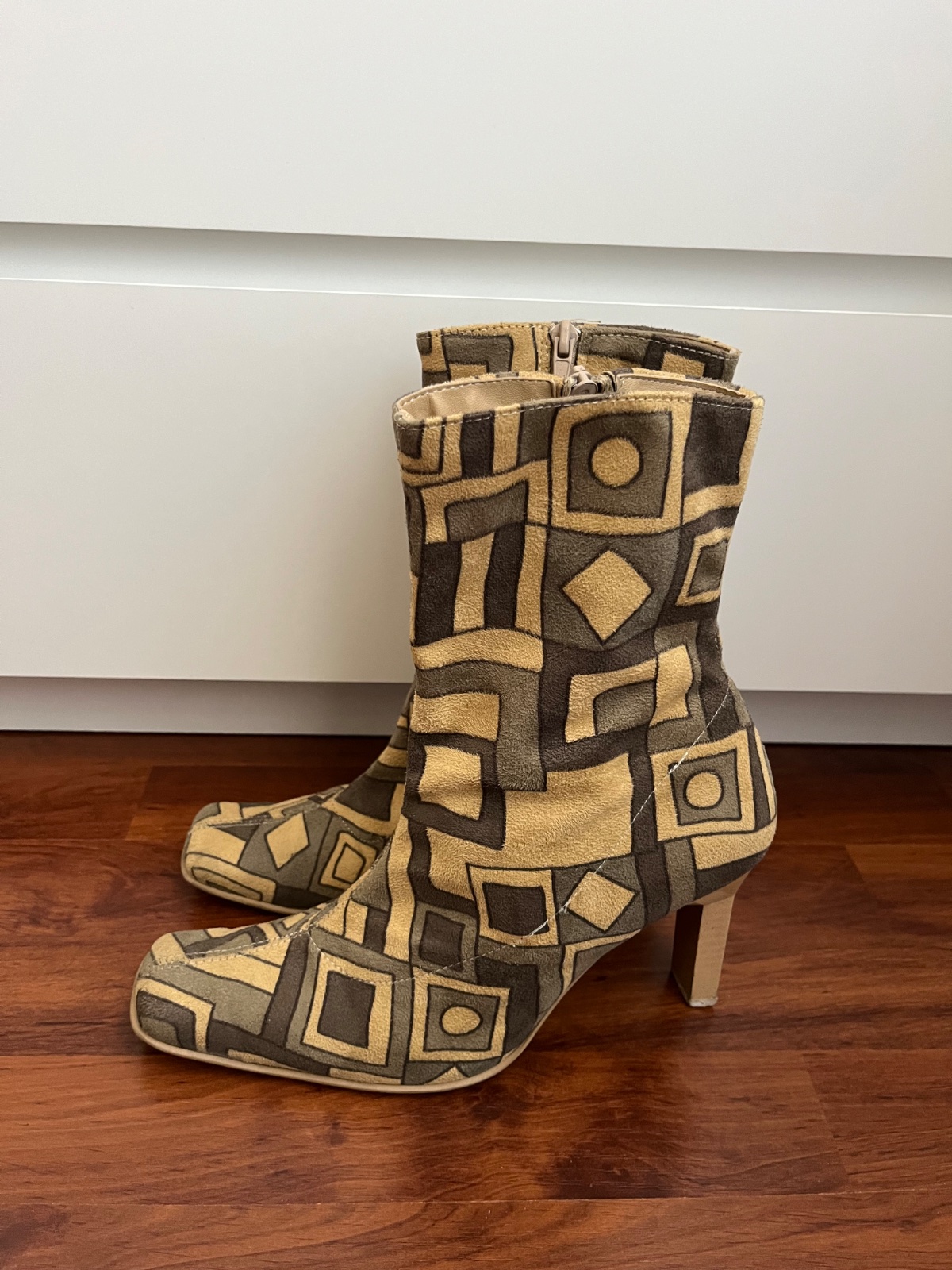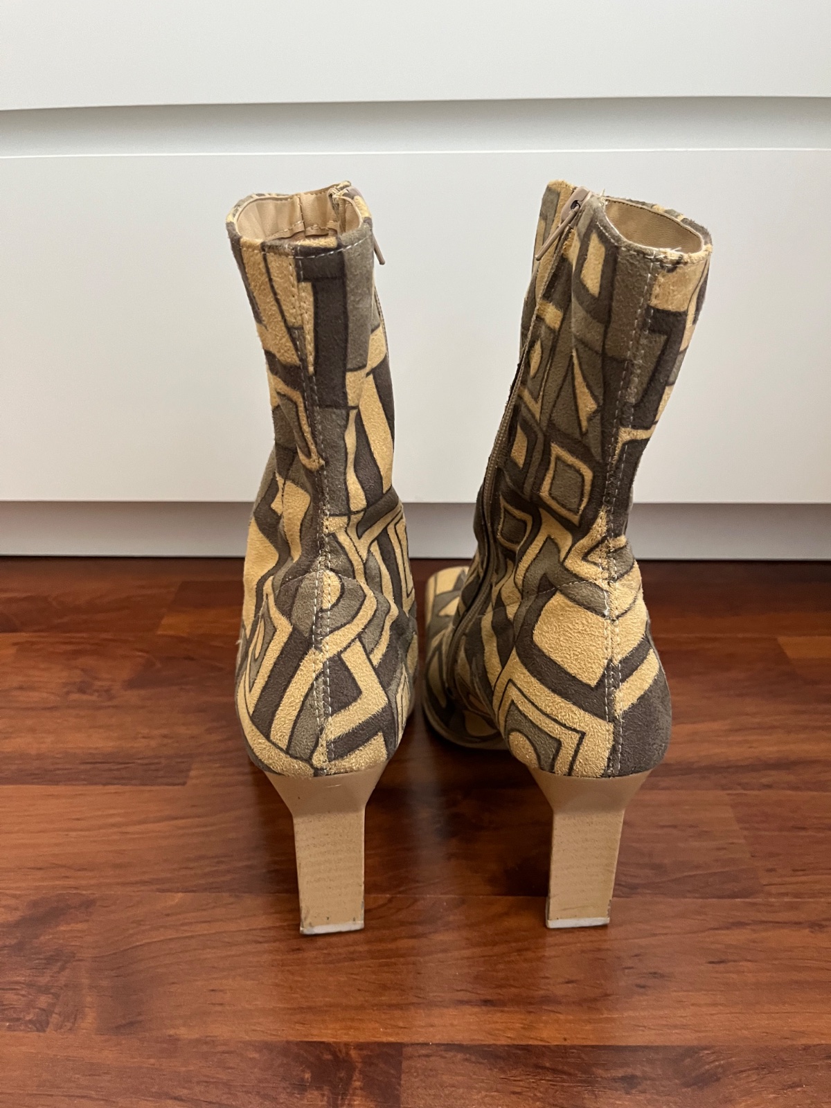 Kozačky jsou kupované v prodejně obuvi. Jsou extravagantní, semišové s podpatkem 9 cm a výška boty je 26 cm, zapínání na zip. Měla jsem je jen párkrát, ale už mi tu jen leží. Vel.40. Vnitřní stélka je 28 cm až do špice. Tudíž pro nohu tak 26,5-27 cm.