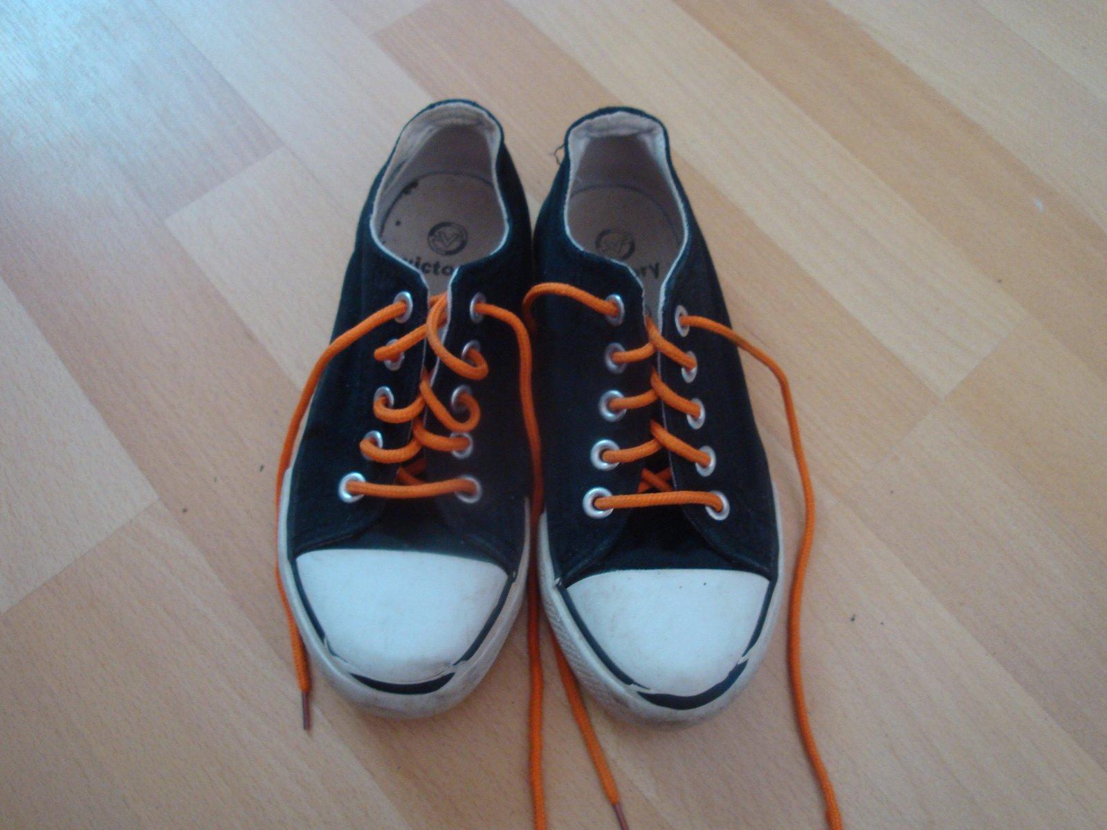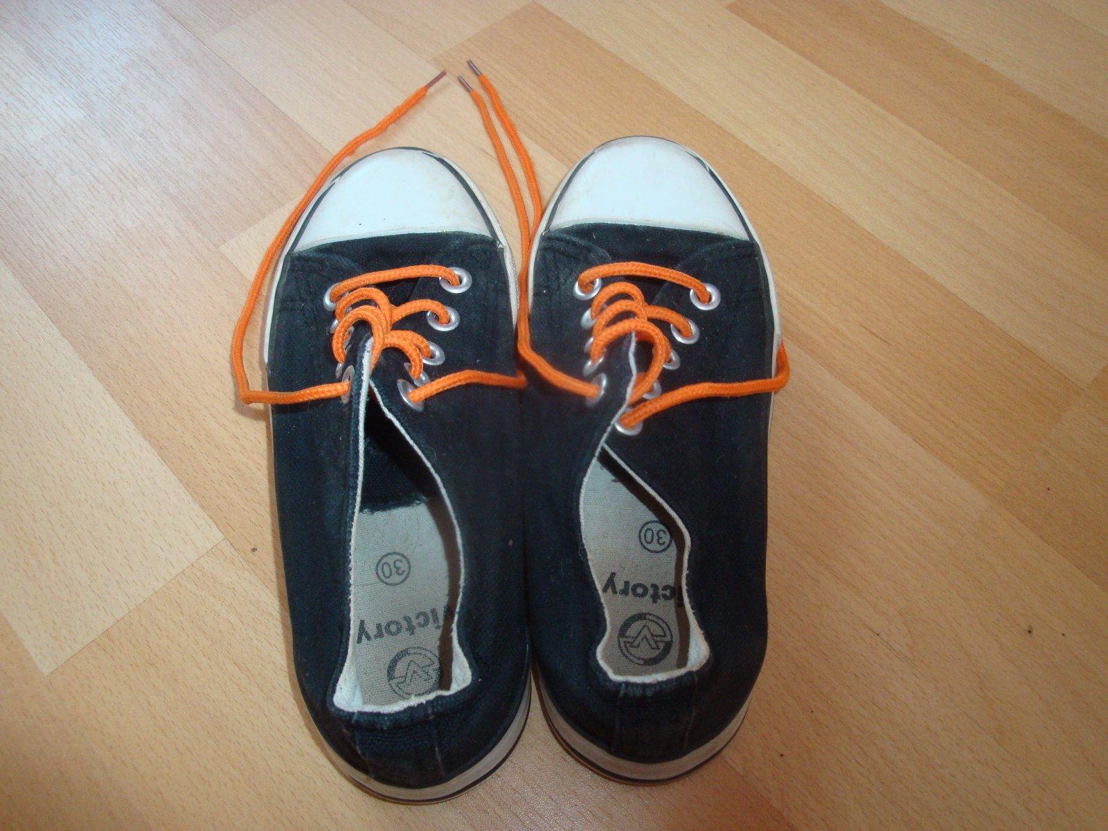 Velmi pěkné a málo nošené tenisky v barvě černé se stylovými oranžovými tkaničkami. Tenisky jsou ve velikosti 30 a jsou vhodné pro chlapce i děvčata, zn. Victory. Top stav.
