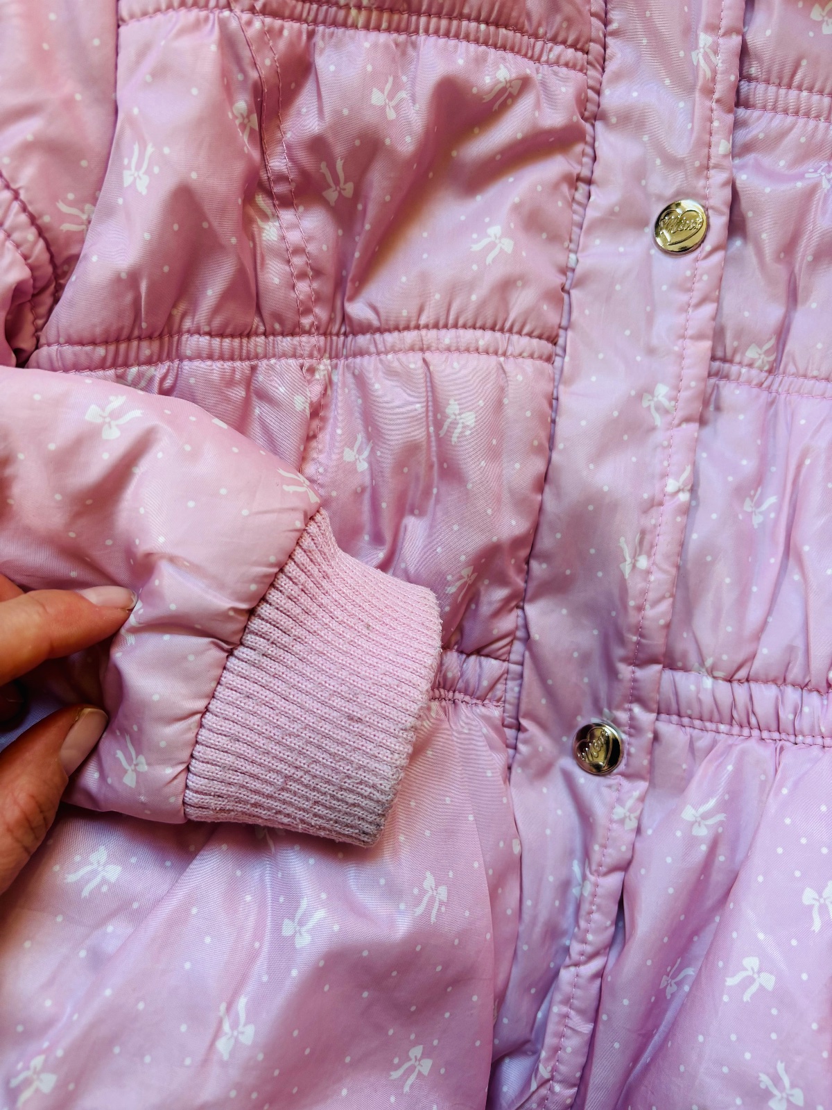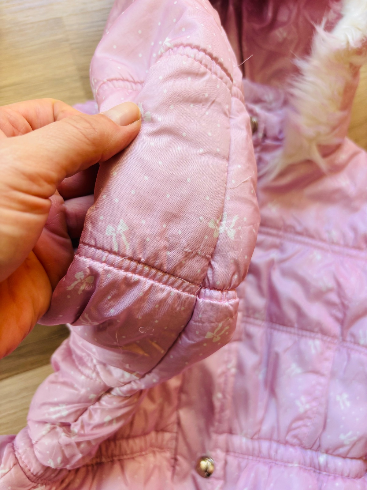náplety na rukávech malinko zašedlé a zespodu , jinak bez vad, není do extra velkých mrazů, výplň v pořádku