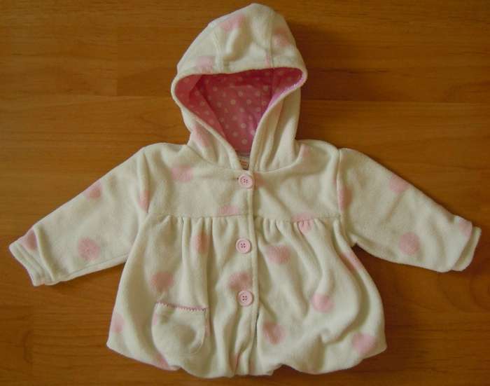 podšitý bavlnou, s květinovými knoflíky, fleese není slehlý, prací chloupek barva je něco mezi tmavě růžovou a bordó