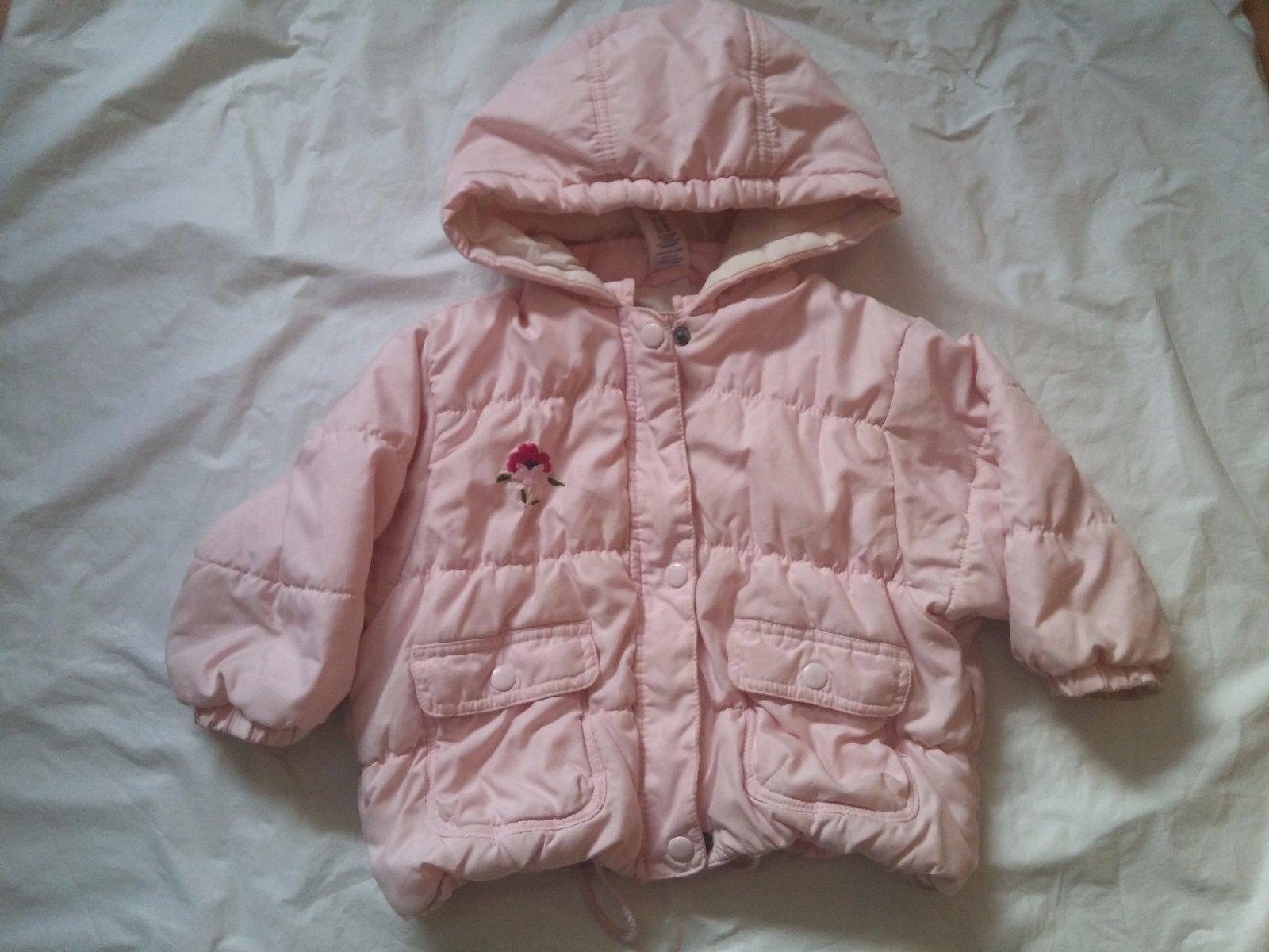 Hezká nošená bunda zn. BHS vel. 86 světle růžové barvy s výšivkou. Bavlněná podšívka. Dole na stažení, kapuca napevno. D. 34 cm. ,rukáv od krku 34 cm. Vhodná jako přechodová.