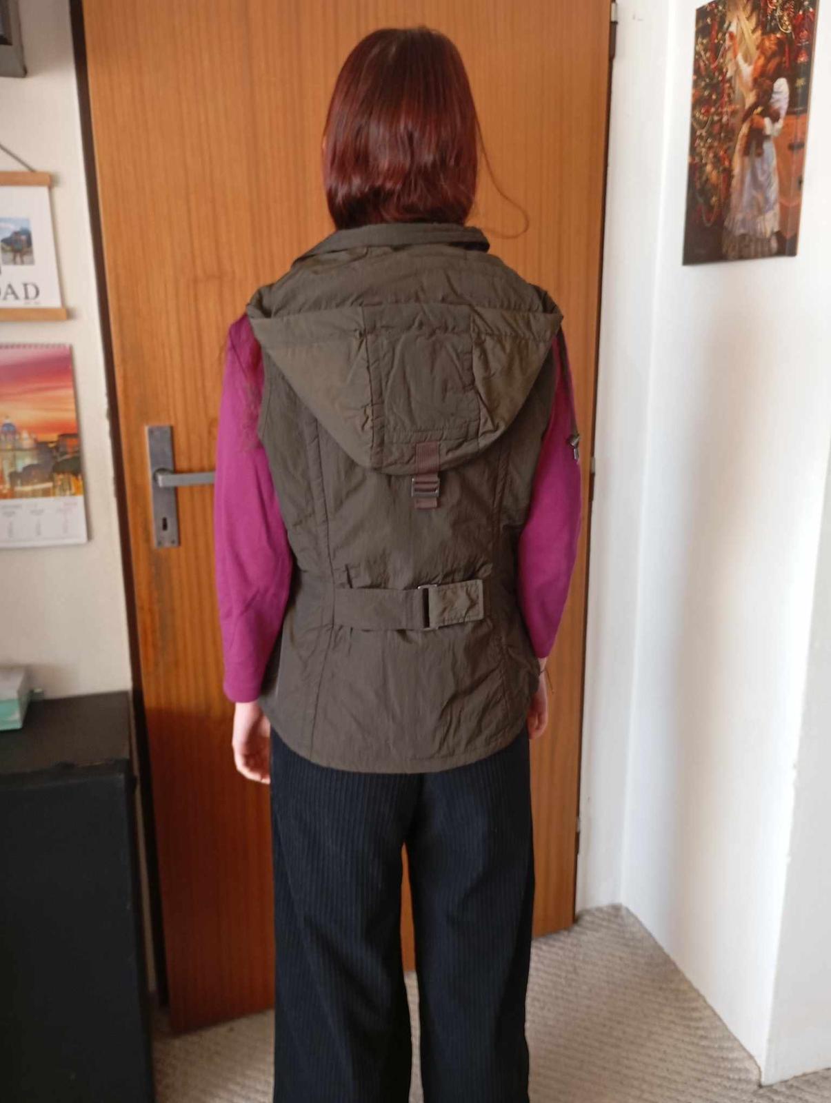 Krásná tm. khaki zelená oteplená šusťáková vesta s odepínací kapucí, slušivý projmutý střih, vel. 36, délka odshora dolů 60 cm, šíře zad pod průramky 47 cm, zapínání na skrytý zip a druky, vzadu páseček na upravení velikosti, jako nová. PC 1299 Kč, nyní cena jen 299 Kč. Značka: PIETRO FILIPI