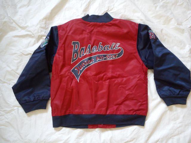 Oboustranná jarní, letní bunda, lehká, z jedné strany červená s obrázkama ze šusťáku, z druhé jednobarevná tmavě modrá a z této strany je pogumovaná, Nošená, bez vad. Délka 39,5 cm, šířka 2 x 36 cm, rukáv od krku 45 cm