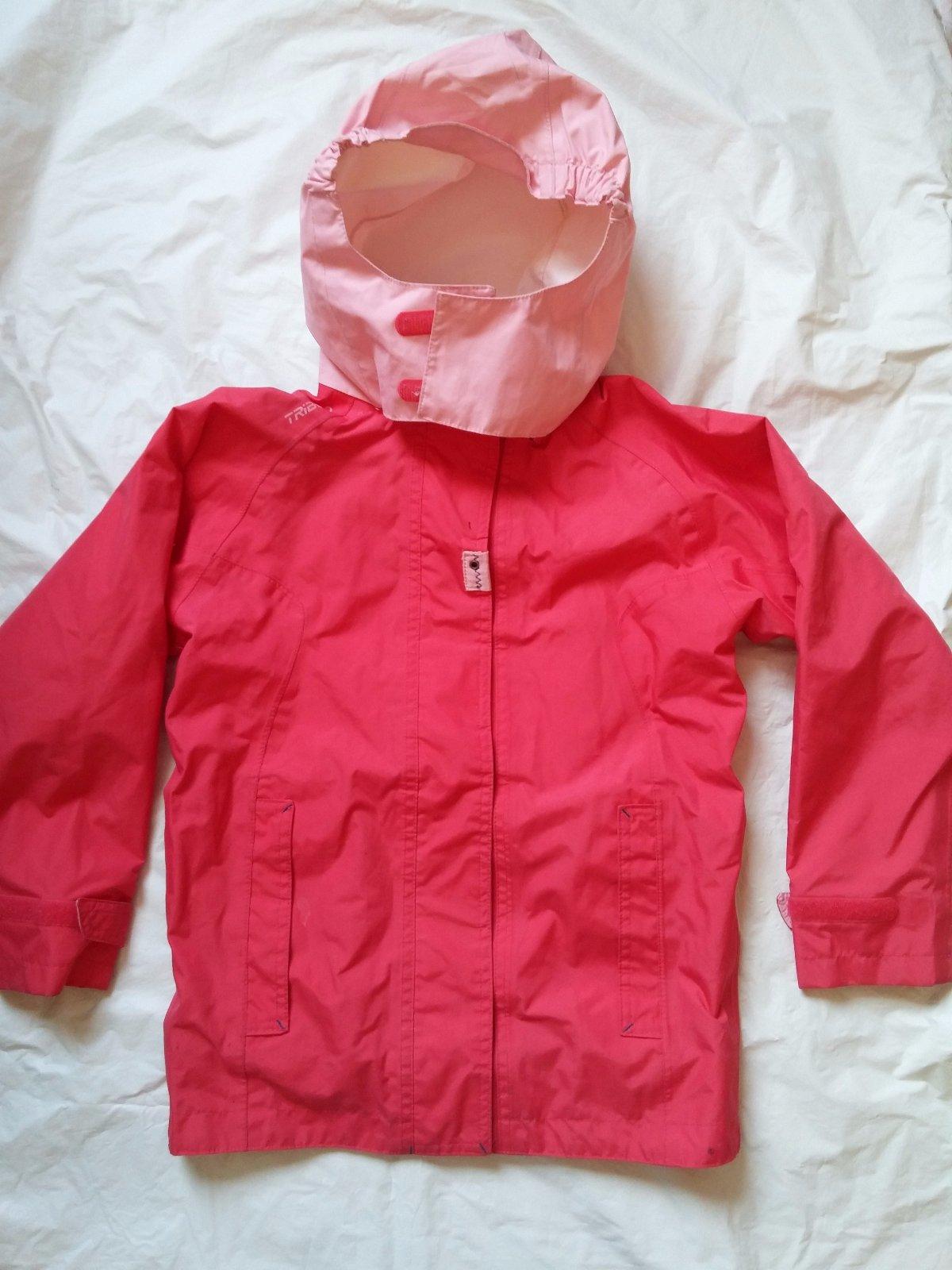 utdoor nepromokavá bunda, super, nepromokne, neprofoukne zn. Triboard z Decathlonu podlepené švy, uvnitř síťovaná podšívka, dole na rantlu pidi flíček, jinak super, d. 55 cm, r. od krku 53 cm, kapucu lze schovat do límce, zásilkovna 70