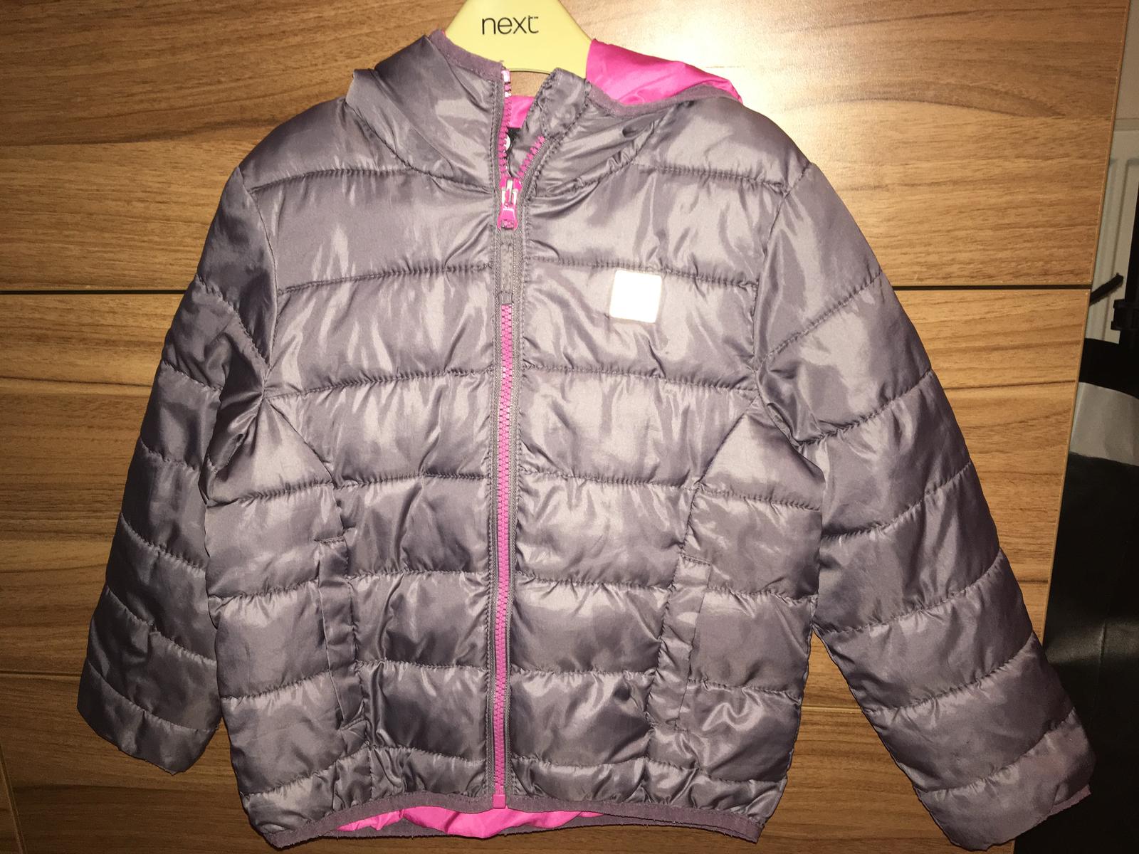 Velikost 110/116. Slabá větrovka na jaro/léto/podzim. Hezká. Reflexní kytička na zádech.