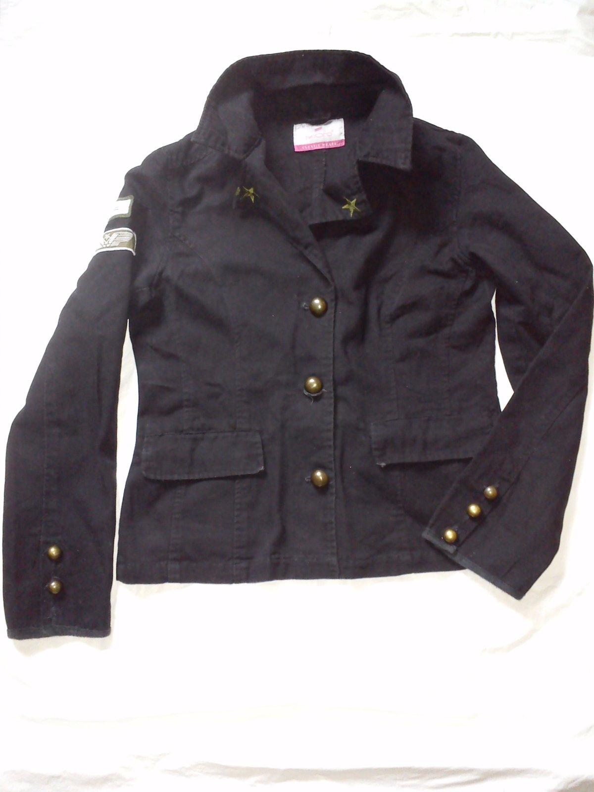 Krásné sportovní sako, černé barvy, lehce vypasované, s nášivkama a výraznýma knoflíkama, trochu vojenský styl. Sportovnějšího stylu, ideální k džínám. Nošeno minimálně, bez jakýchkoliv vad. Vzadu v pase ozdobný pásek. Délka 55 cm, šířka 2 x 47 cm, rukáv od krku 66 cm