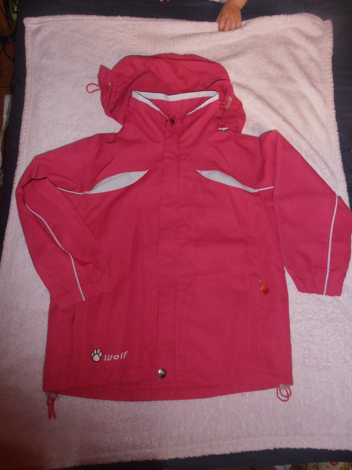 červená, neutrální, vel.bude 122 (uvedeno 128 na cedulce) Na ramenou na před.díle a zadním díle reflexní proužky ,slabá,podšitá je pouze hladkou slabou látkou. V límci -stojáčku je schovaná kapuce ...