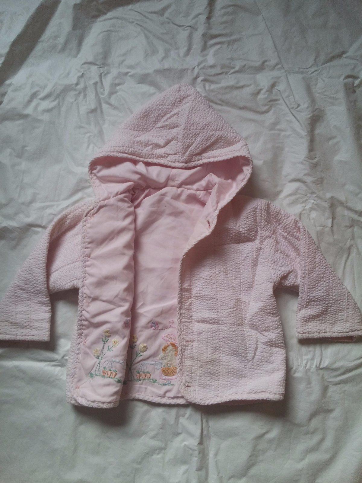 Pěkná oboustranná bundička s aplikací (růžovo bílá)na knoflíky. Délka 37 cm, šířka 2 x 37 cm, rukáv od krku 39 cm. Bundička je nošená, ale zachovalá.