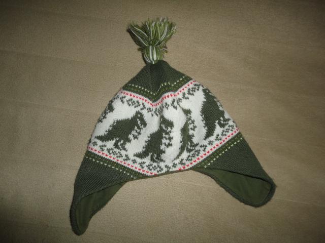 Málo nošená, šetřená, acrylová čepička s vypletenými dinosaury na vnější straně, uvnitř 100% bavlna, nahoře střapeček, výška vpředu 17, výška vzadu 18,5cm, obvod kolem hlavy 47-52cm, rukavičky na palečcích na straně k dlani bílé flíčky, asi od barvy, jsou také dvojité, uvnitř úpletek bavlna, d. 14,5cm od začátku palce nahoru 8, š. v místě palce 8,5cm