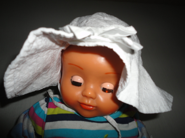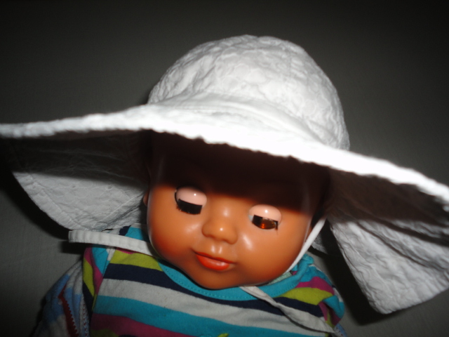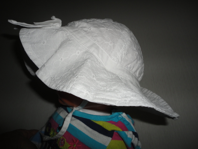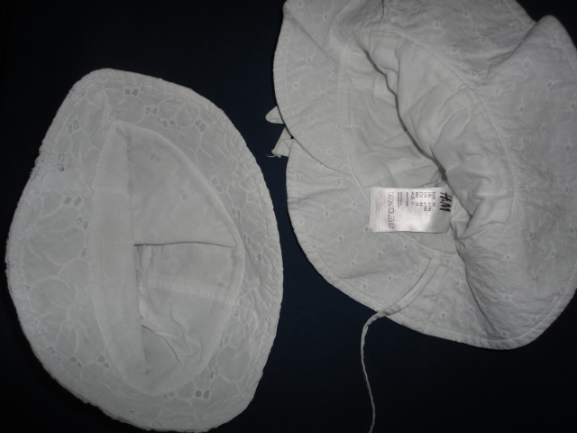 Zavazovací klobouk z H+M, v hlavové části vypodložení plátýnkem, zdobná mašle nad lemem, který je obzvlášť honosný, tkanice mají místy málo patrné mapy po flíčku, jak malá dala občas do pusinky s jídlem, nic zvlášť viditelného, uvádím pro pořádek, výška po konec tkanice nad lemem 13cm, celková výška 19, odvod v místě tkanice 47cm, další klobouček naleznete v mém albíčku