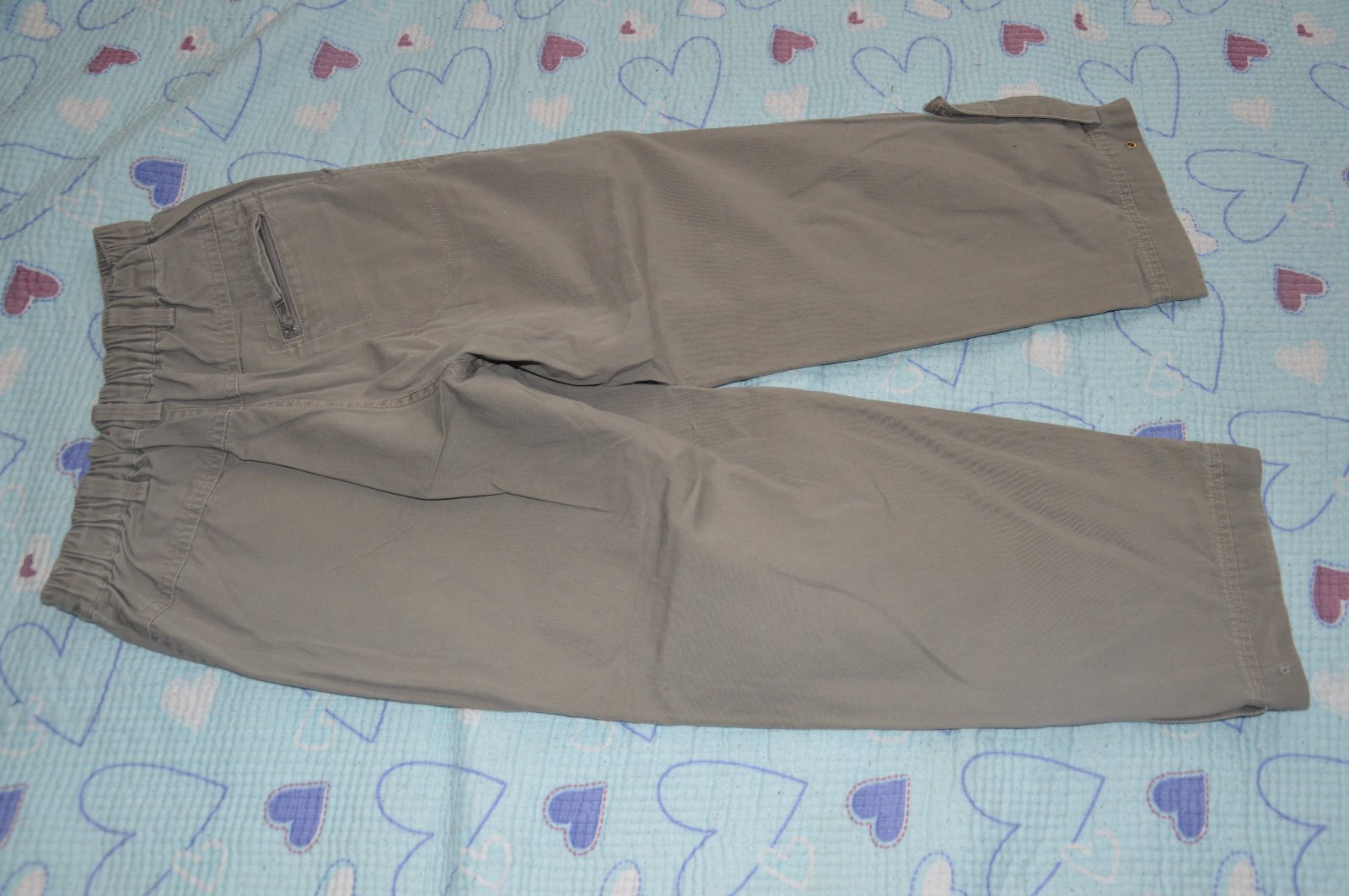 100% bavlna, zn. Wolf, uvedena vel. 110, ale vydrží déle, měřte: délka 46/70cm, pas na gumu, š v pase 2x26-32cm, jedno koleno drblé, jinak fajn.