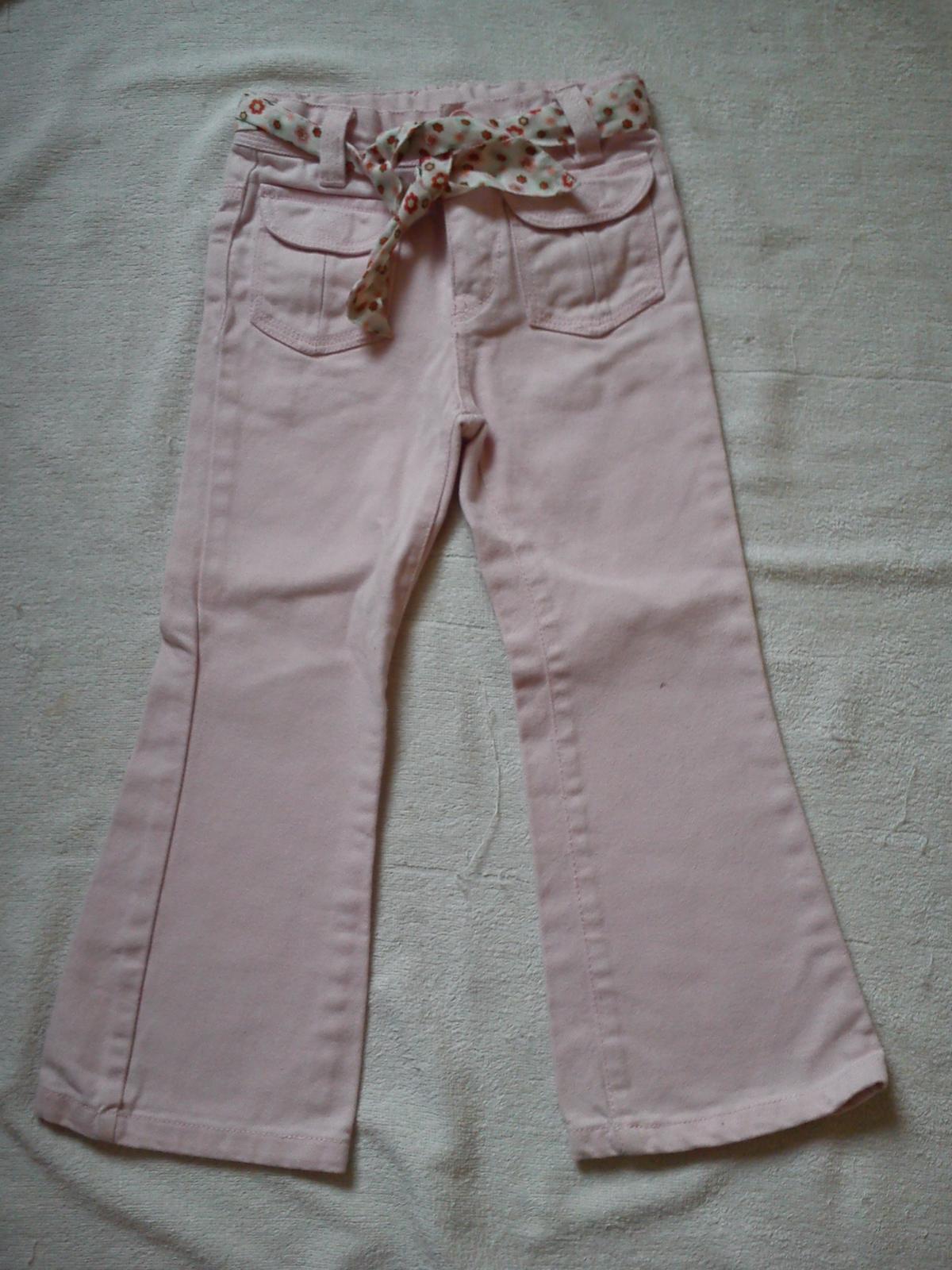 Moc pěkné, nošené, bez vad džíny, rifle světle růžové barvy s páskem, v pase regulace. Vel. 4-5 let Délka 61 cm, pas max. 2 x 26 cm, vnitřní nohavice 43 cm