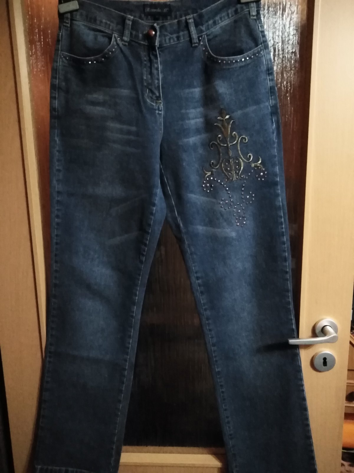 Paradni jeans Hula v dobrem stavu-jen na jedne nohavici jsou skvrny( zašité pididírky - vytáhlé nitě), vel UK12 , UK40, 77% bavlna , 2%elasten, 21%polyester, 2 kapsy vpredu, 2 vzadu, delka 104cm, ...