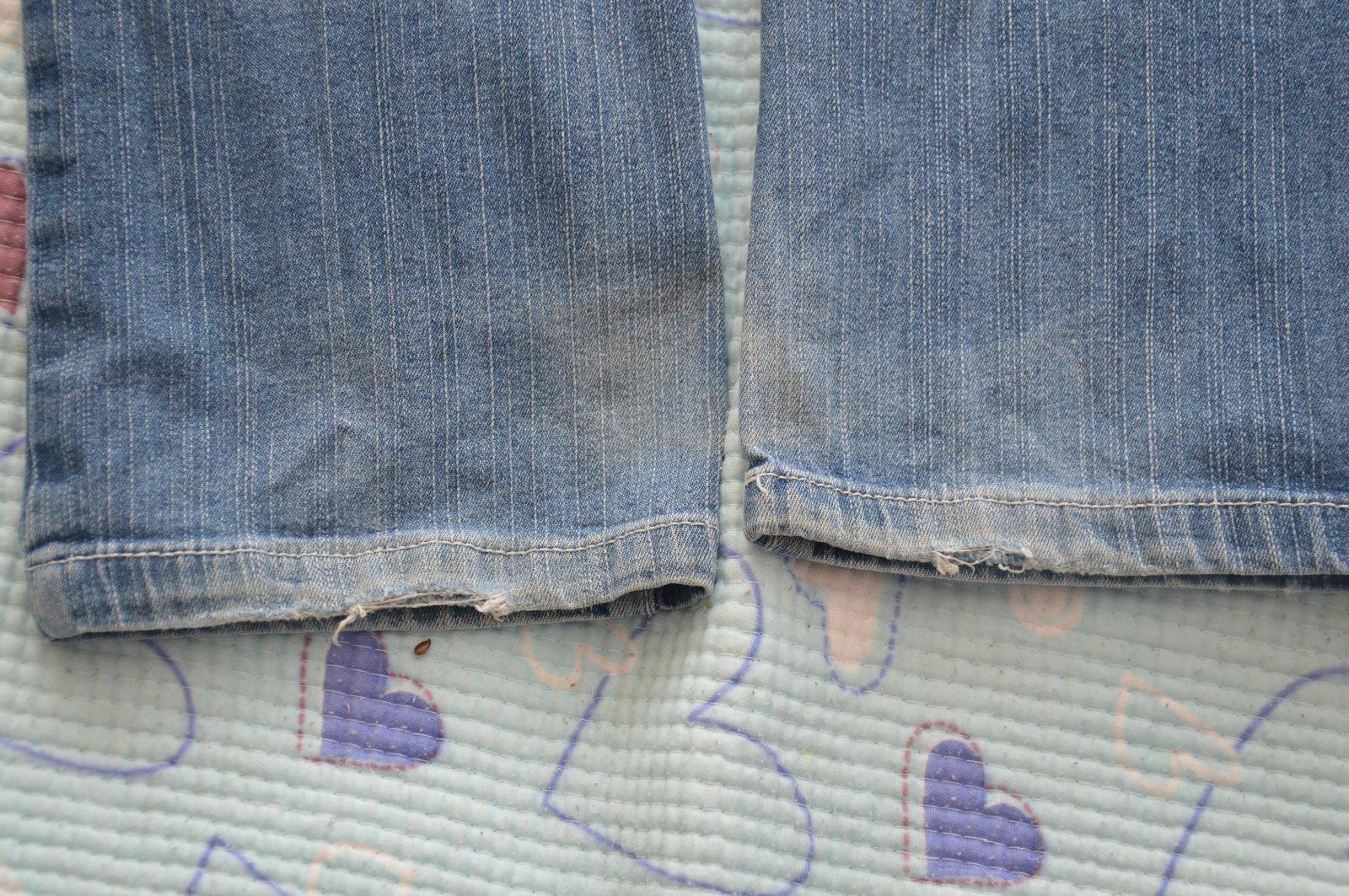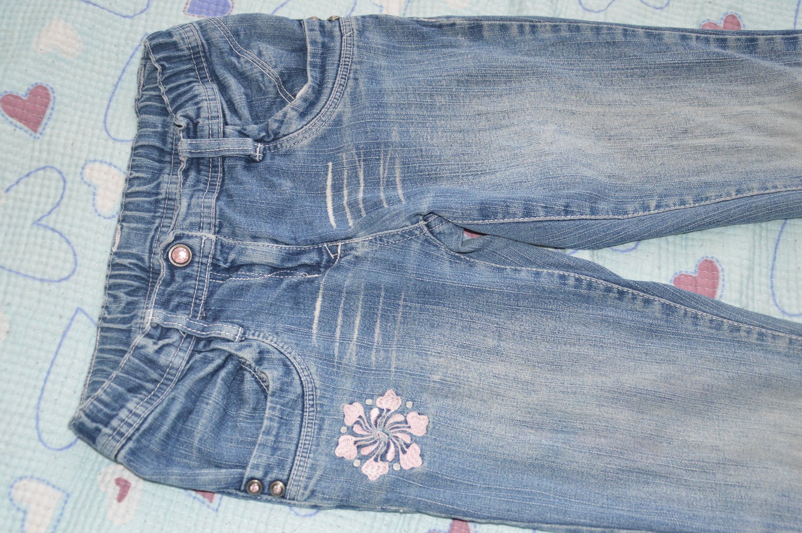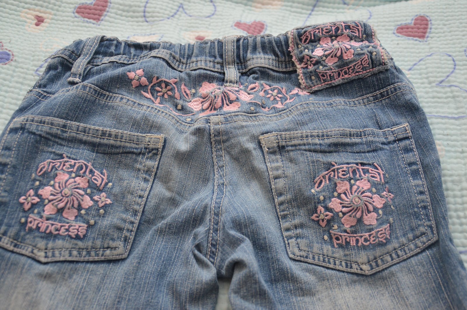 středně silné džíny s bohatou výšivkou, jedno koleno opraveno spodními záplatami, jinak bez vad, v pase regulační guma, supr džíny do školy, proto oblíbené - nošené, ale ještě poslouží.